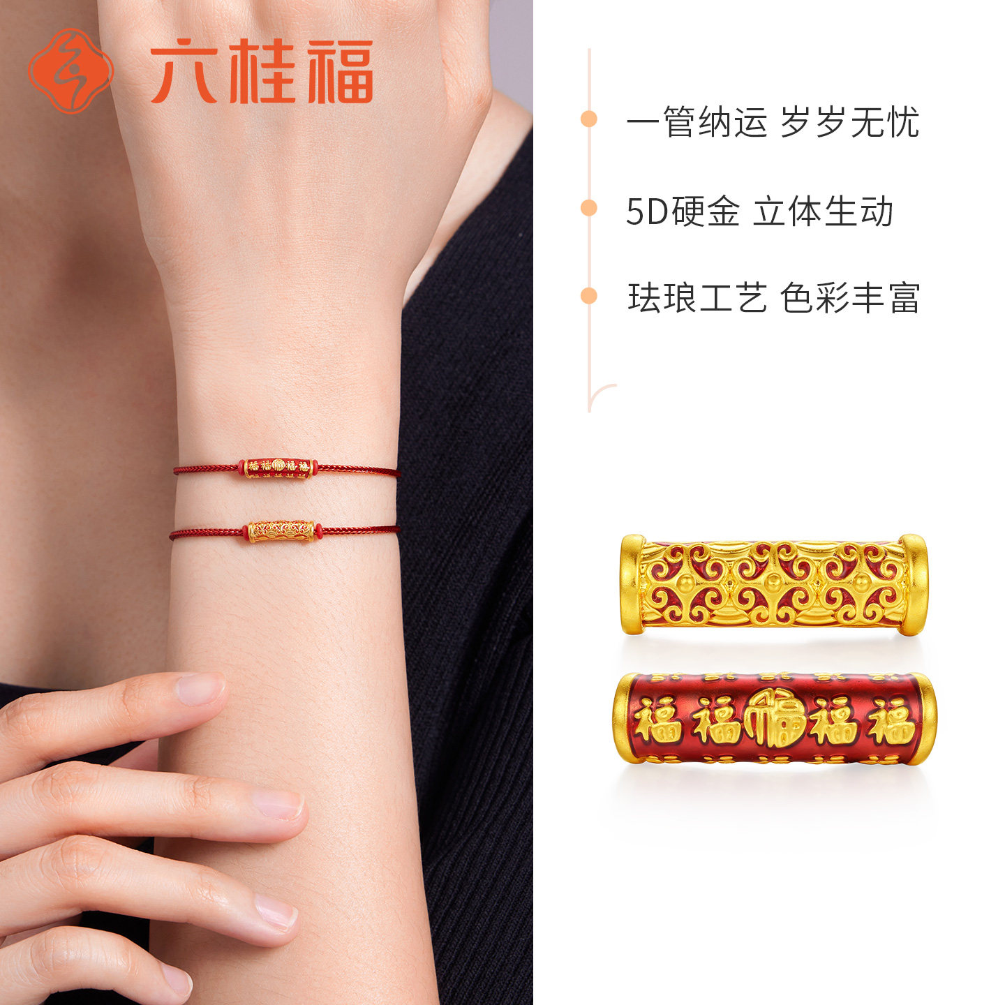 转运珠生日礼物 六桂福珠宝黄金来福路路通经传筒手链男女款