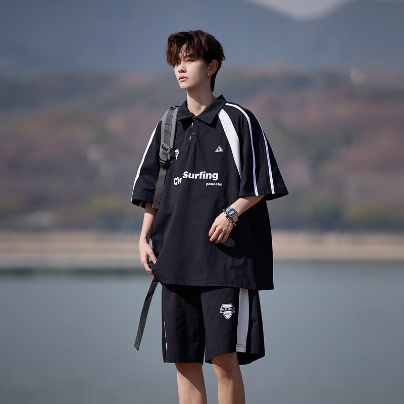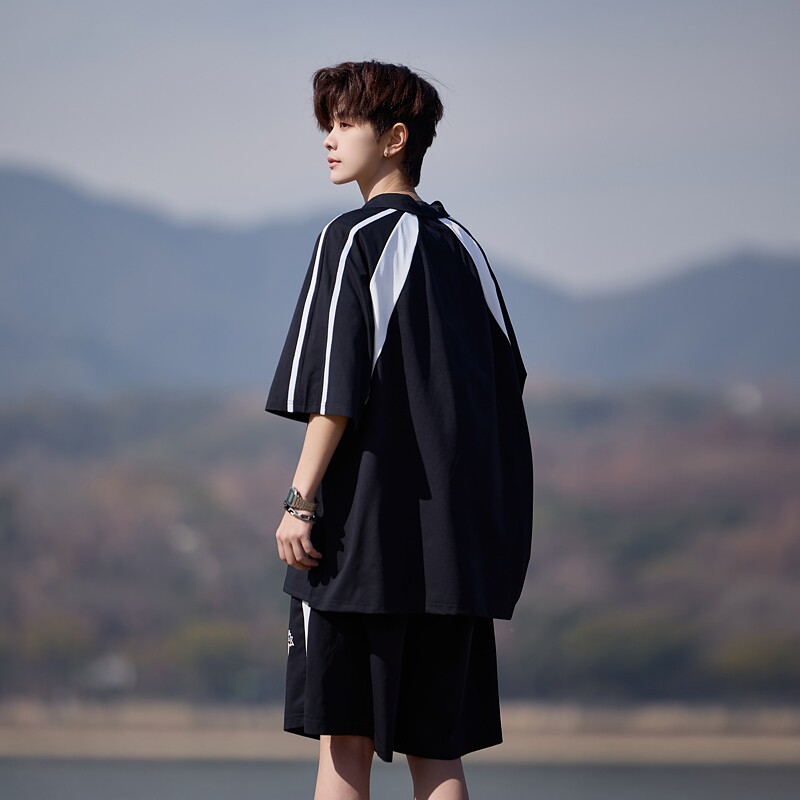 男夏季 胖胖哥美式 复古撞色短袖 套装 两件套 宽松运动休闲短裤
