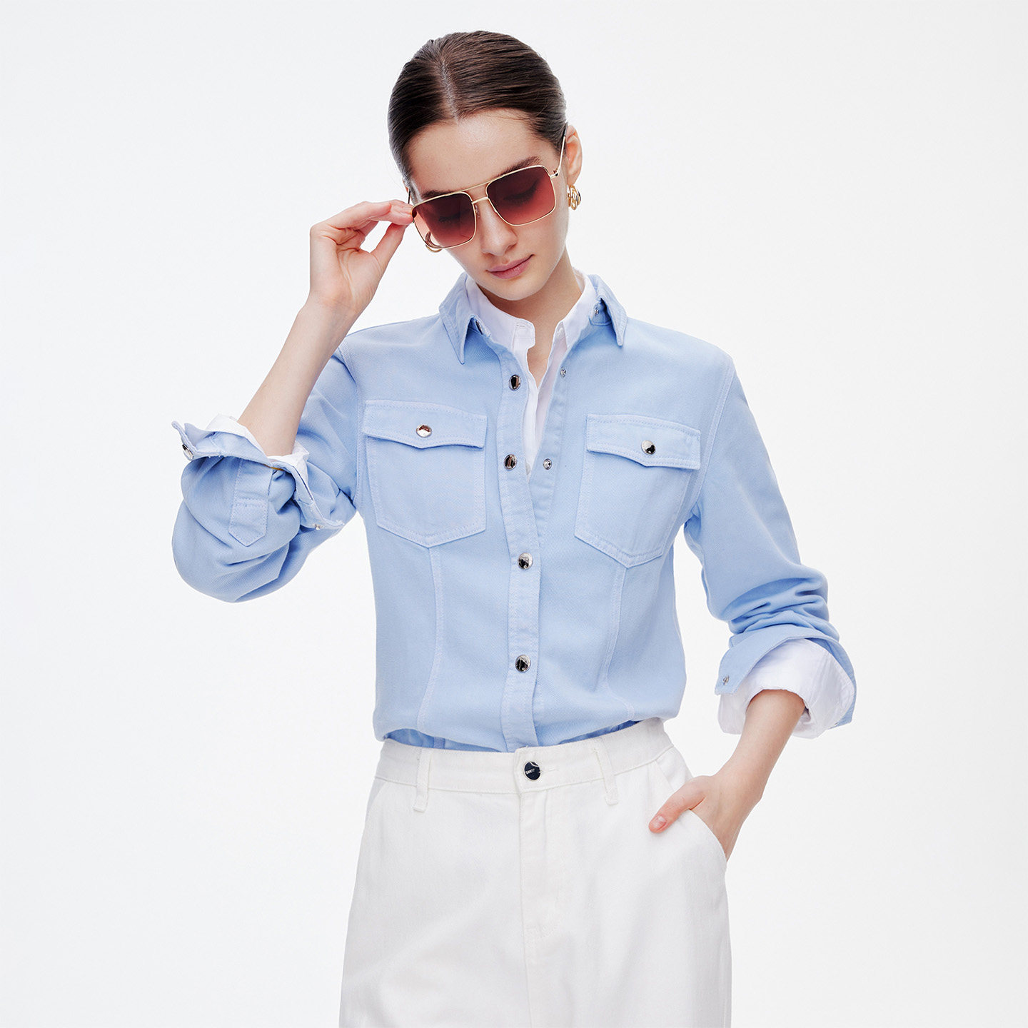 班尼路S&K系列蓝色冰丝抗皱衬衫 防晒宽松衬衣女士免烫上衣Q 女夏季