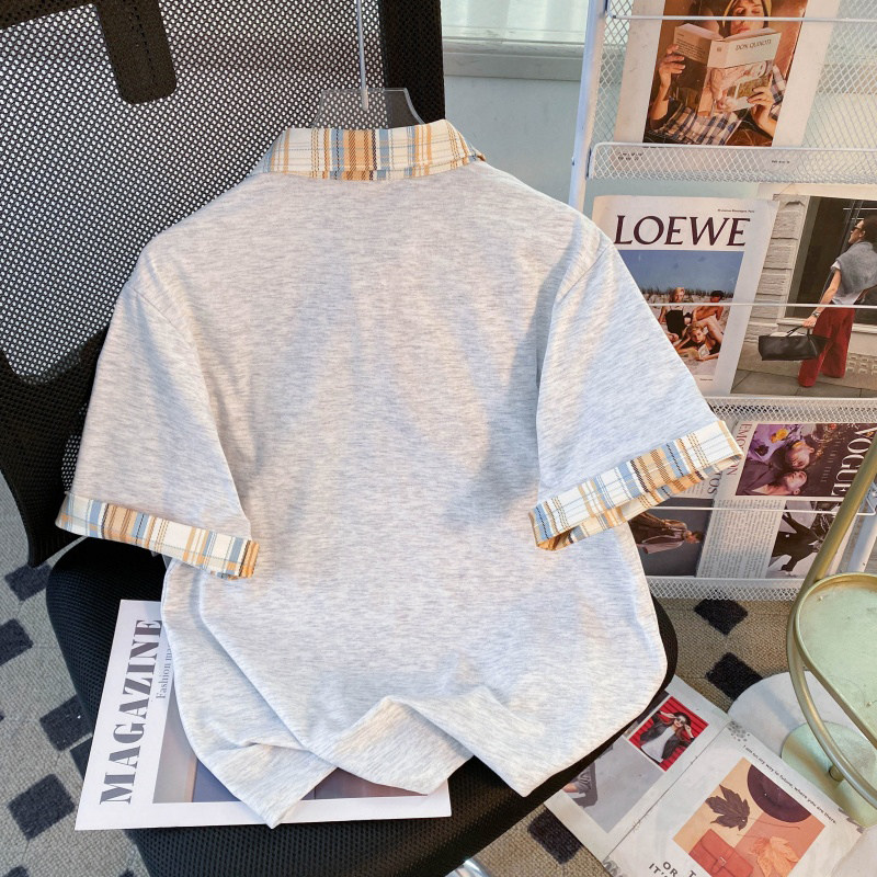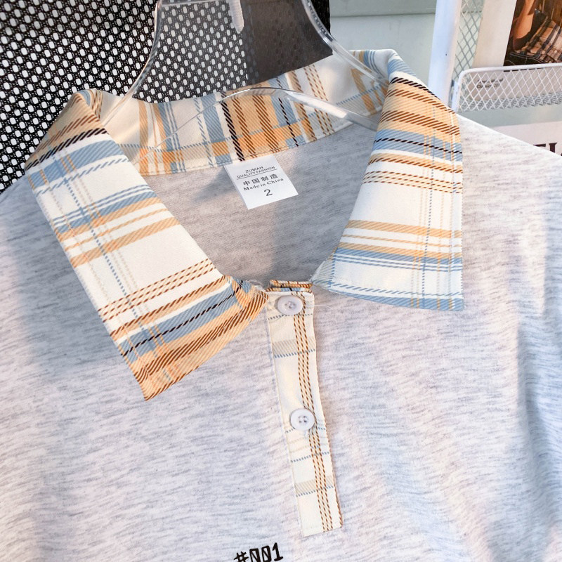 宽松美式 复古t恤格子上衣短袖 美式 多巴胺ins 新款 夏季 polo大码 韩版