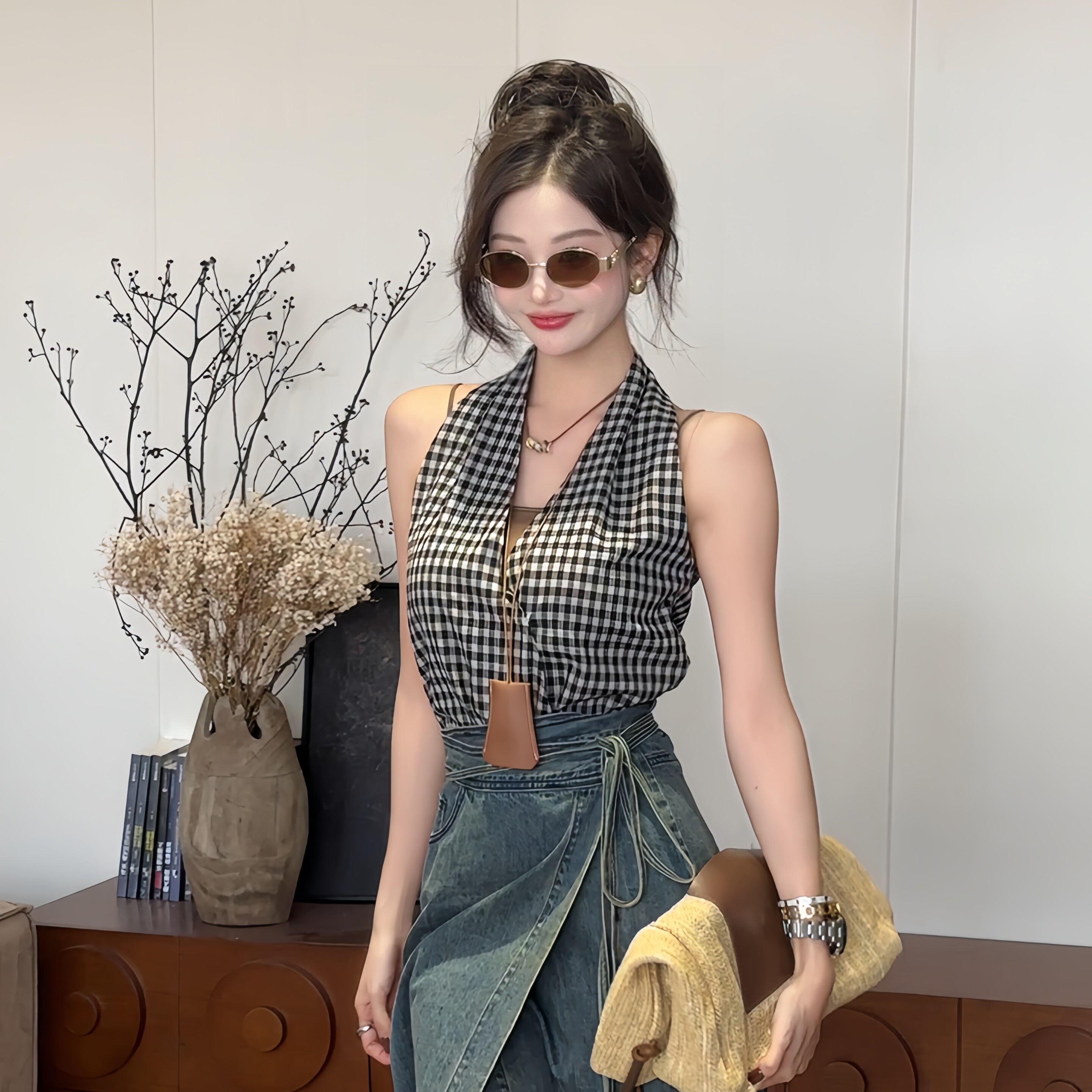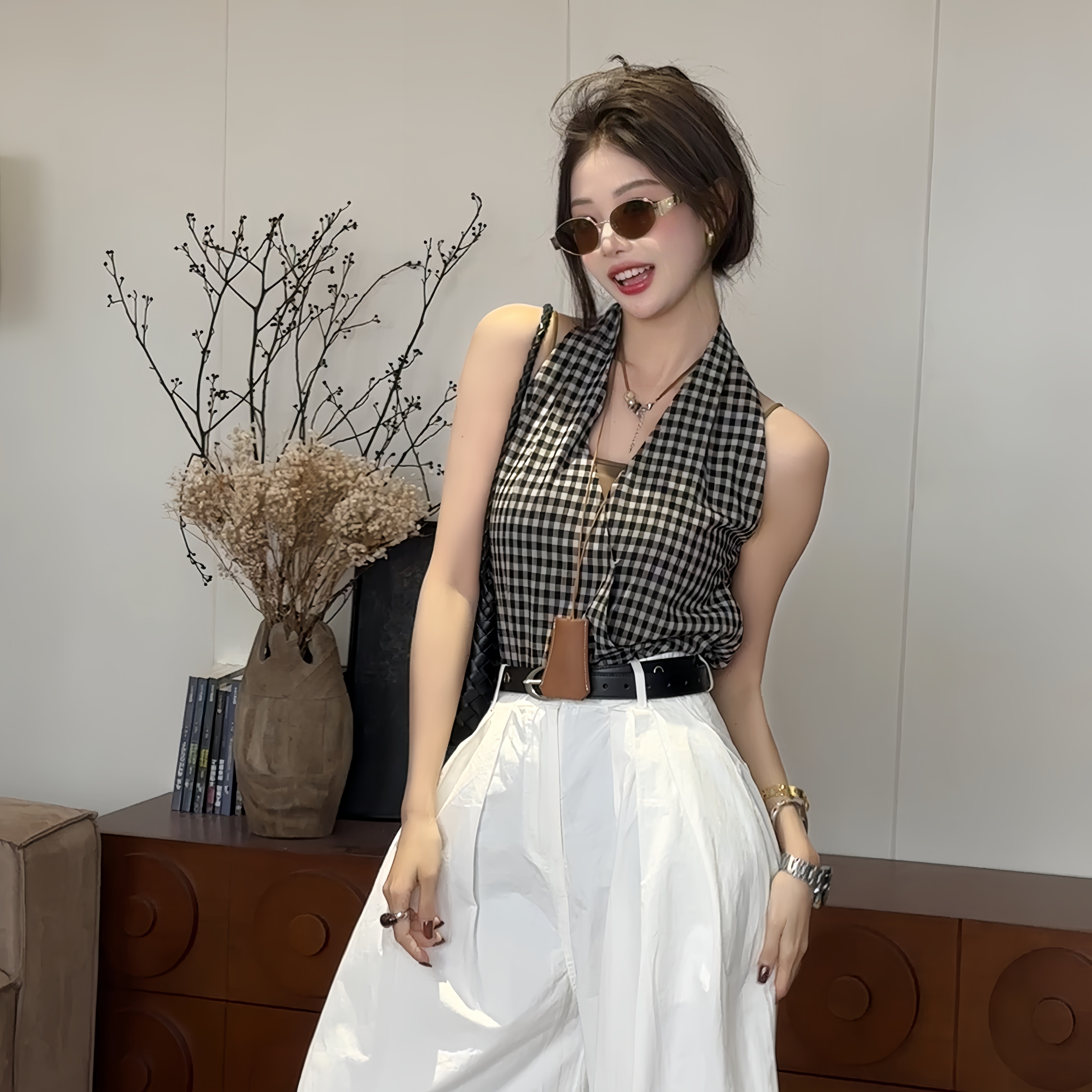 利达NEWDADAD复古格纹两件套装 TP1117 女挂脖上衣露背收腰直筒长裤