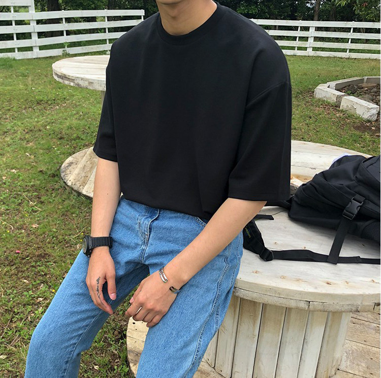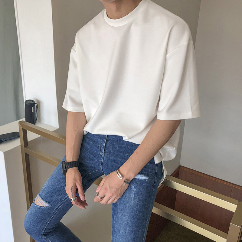 五分短袖 男T恤港风文艺bf男生潮流休闲体恤宽松纯色5分上衣打底衫