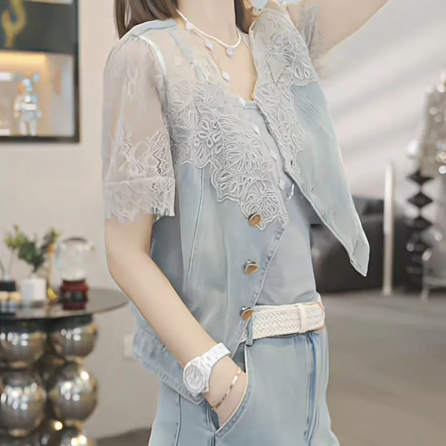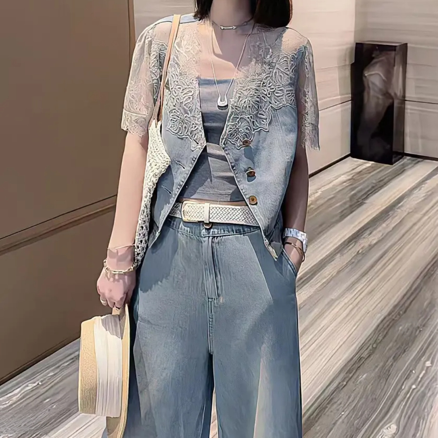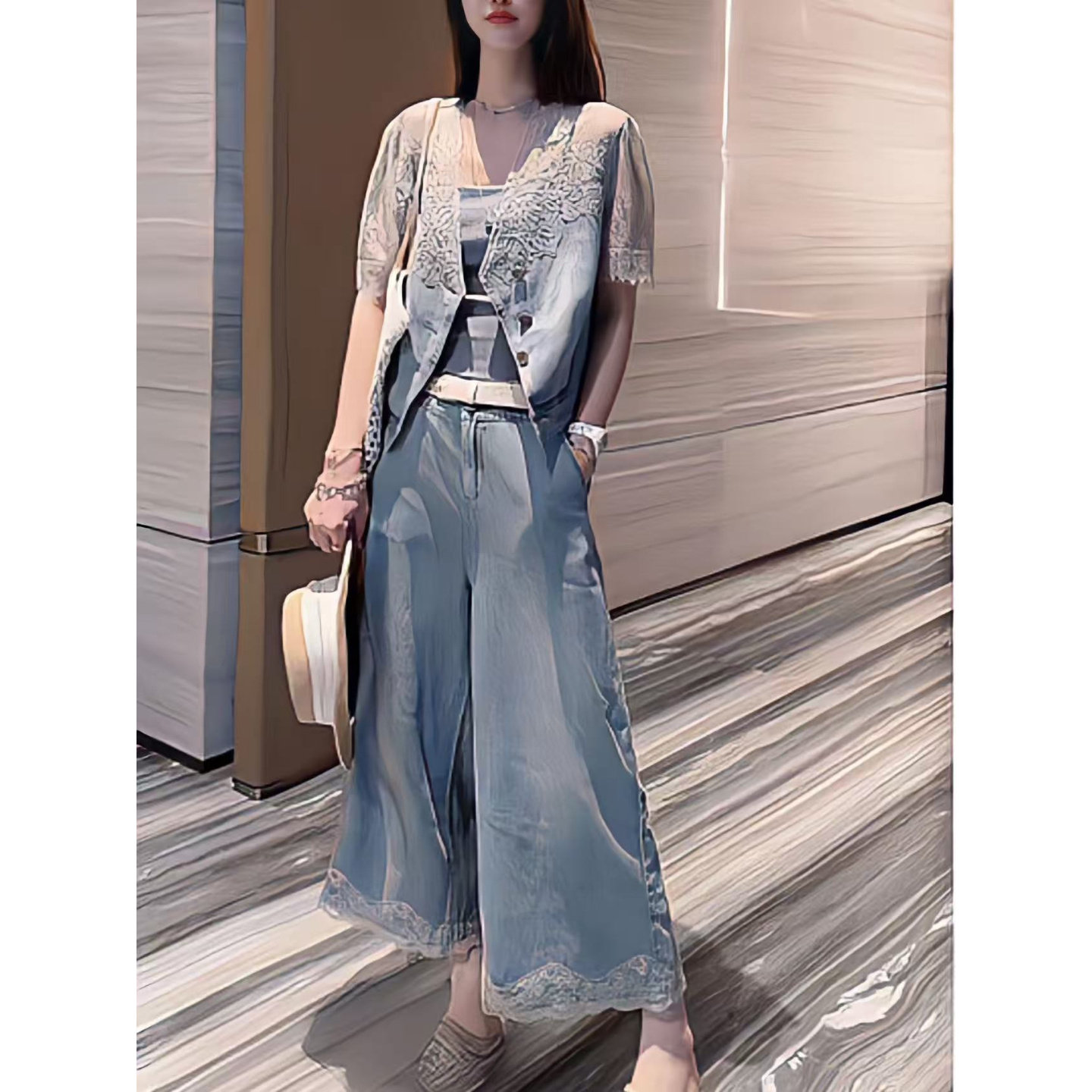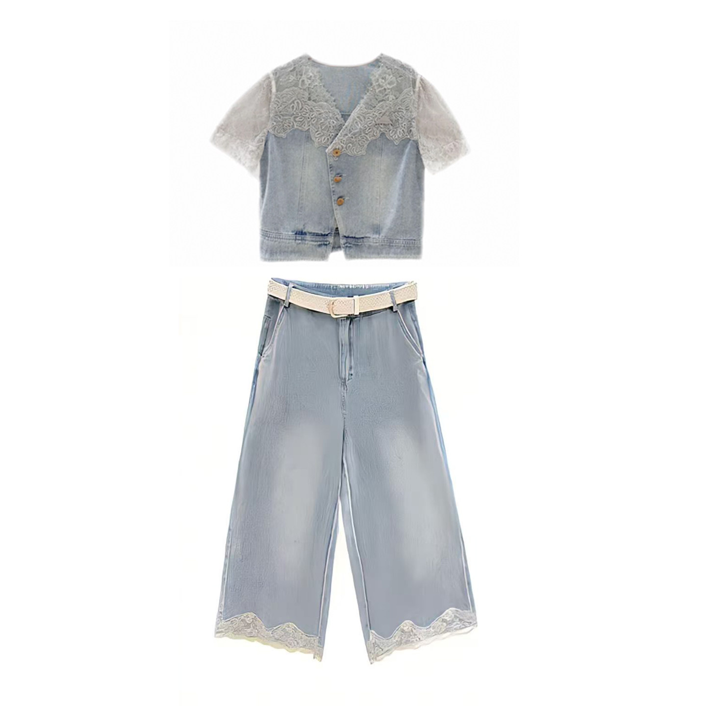 为您提供商品女夏季 洋气时尚 蕾丝花边牛仔上衣阔腿裤 套装 高腰显瘦两件套 新款的详细介绍,
