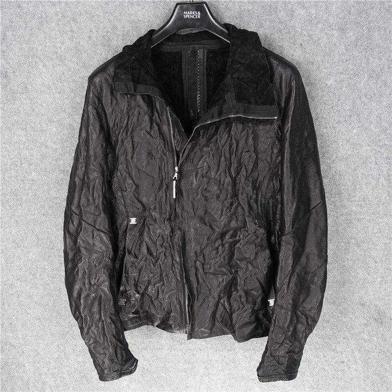 暗黑系列压胶对缝拼接无衬三金属龙骨胎牛皮皮衣男不对称领手套袖由