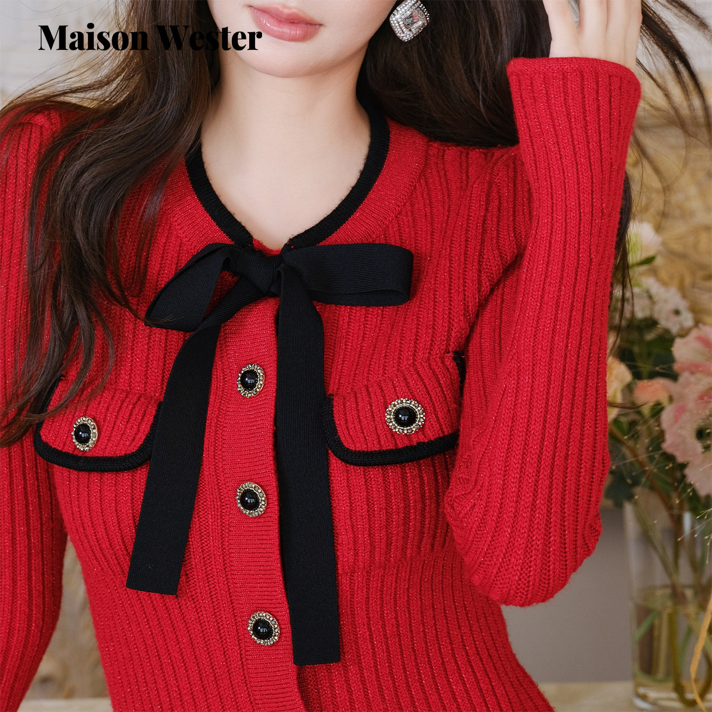 Maison 新品 千金风红针织裙子黑飘带修身 连衣裙 Wester2025年冬季由