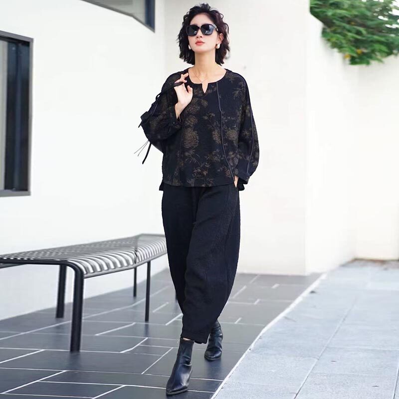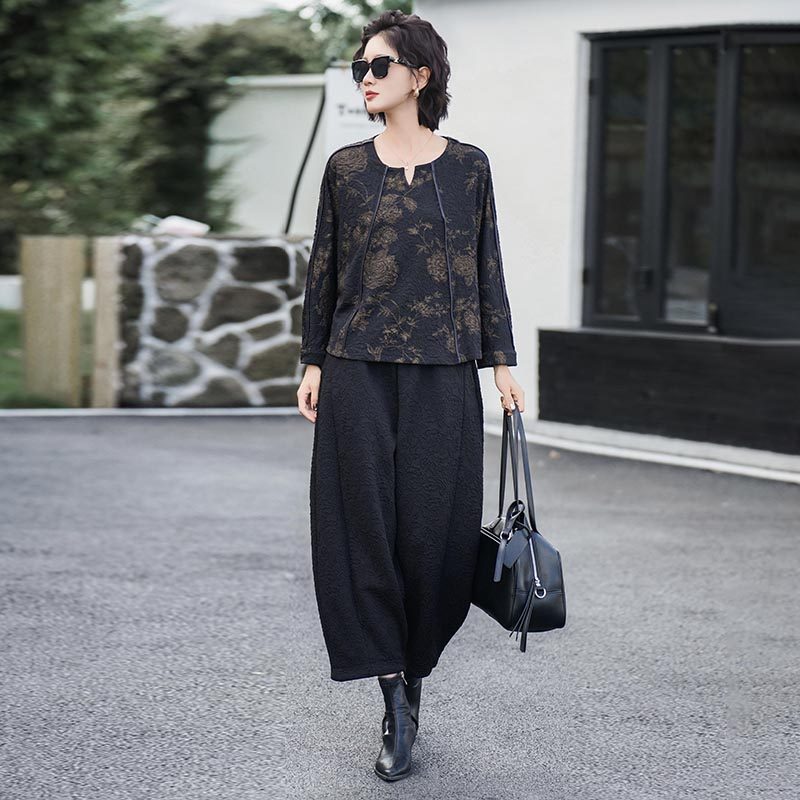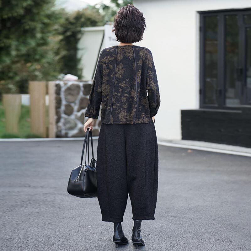显瘦洋气减龄气质两件套装 复古提花棉宽松遮肚上衣灯笼裤 高端大码