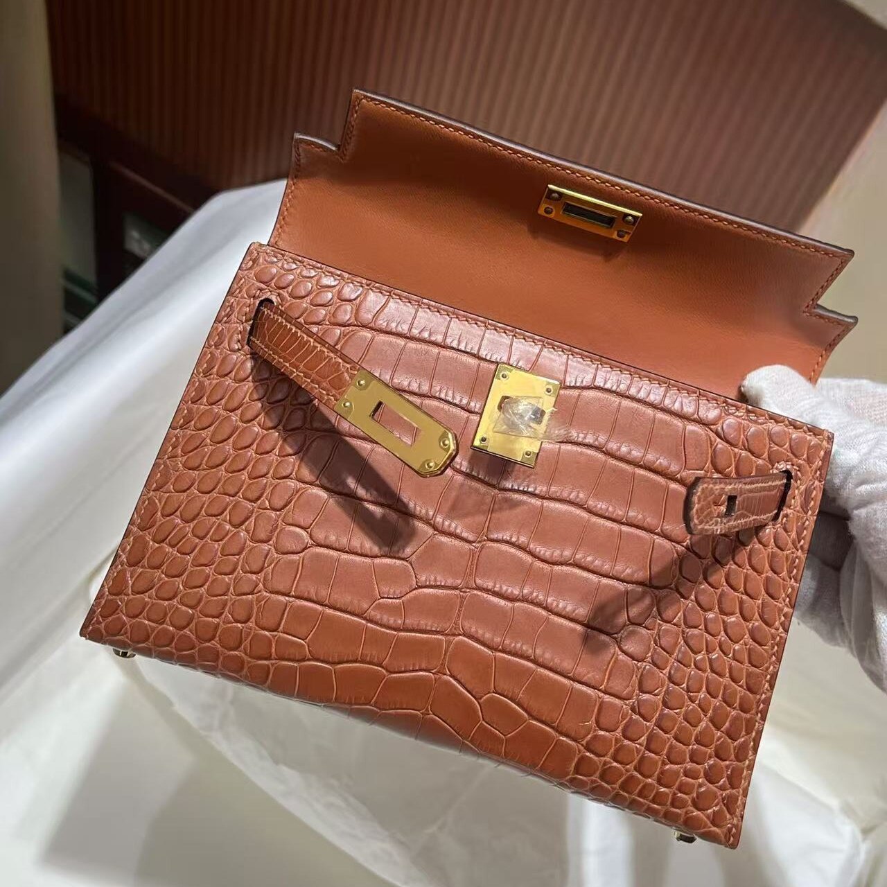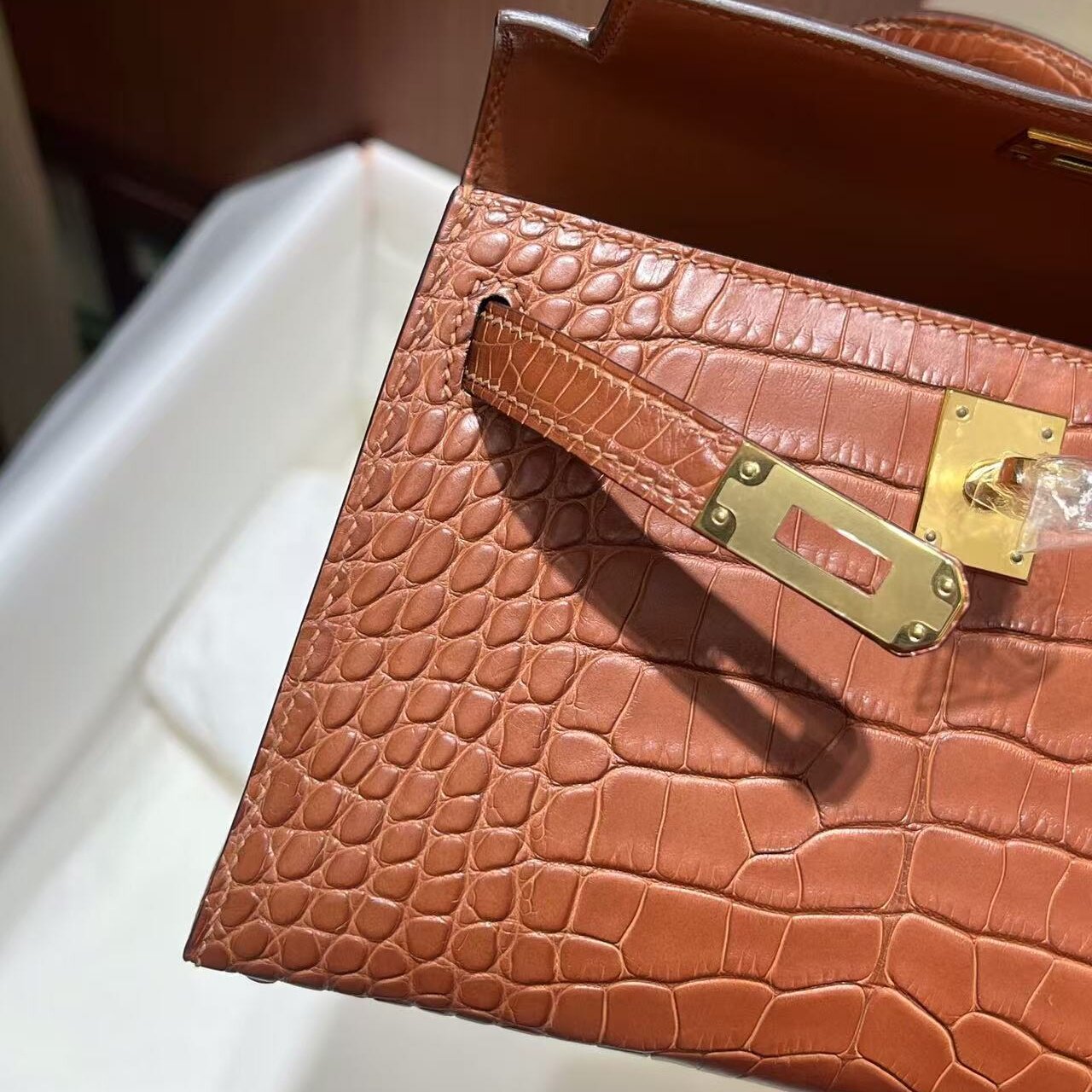 雾面方块美洲鳄鱼皮迷你凯莉二代mini女士单肩斜挎小包纯手工金棕由