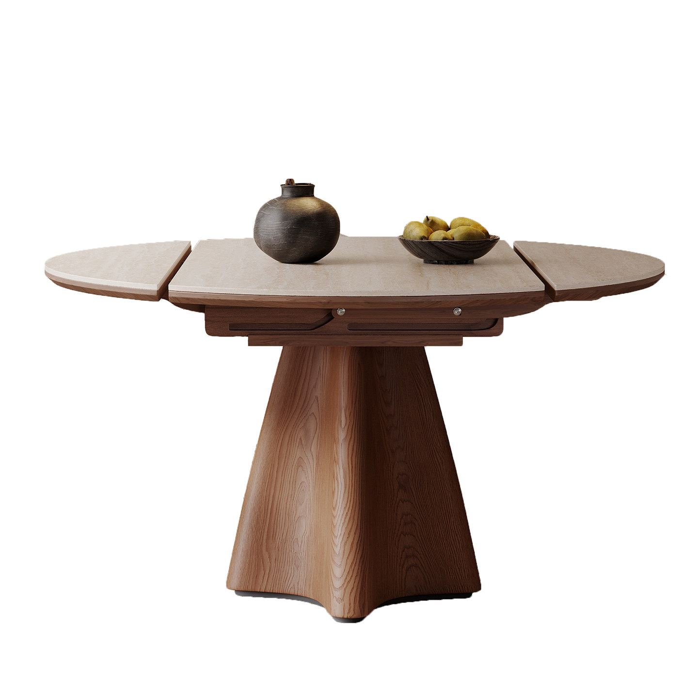 一栖一木洞石岩板实木伸缩餐桌圆形中古风家用小户型圆桌折叠饭桌