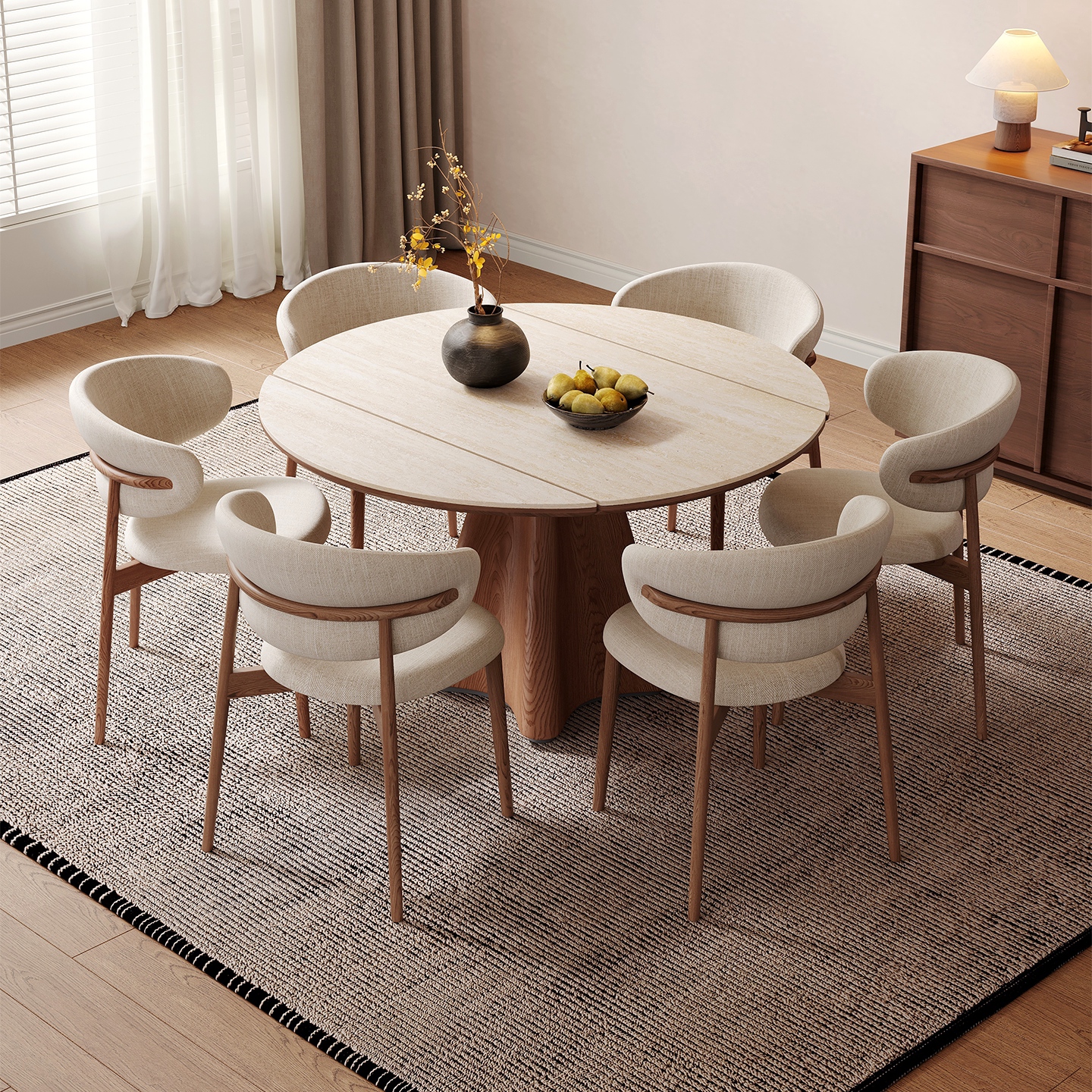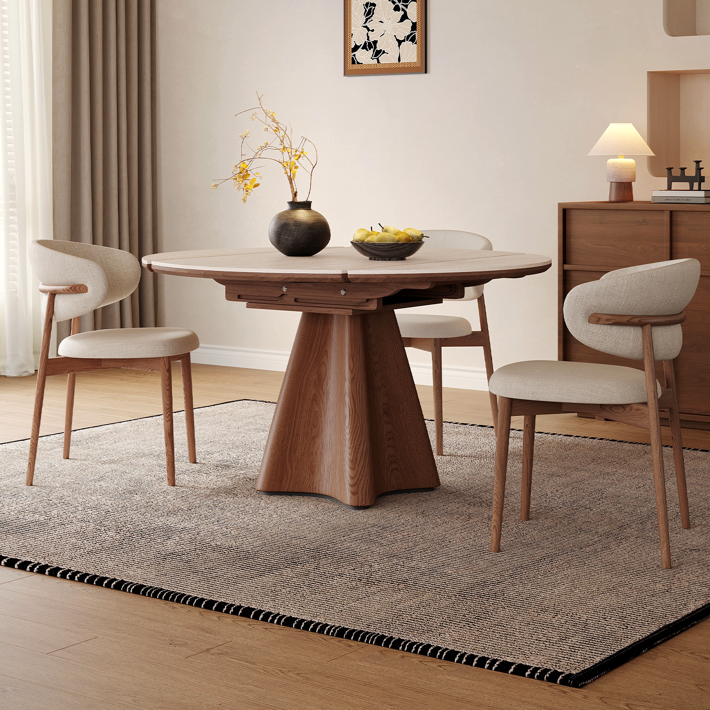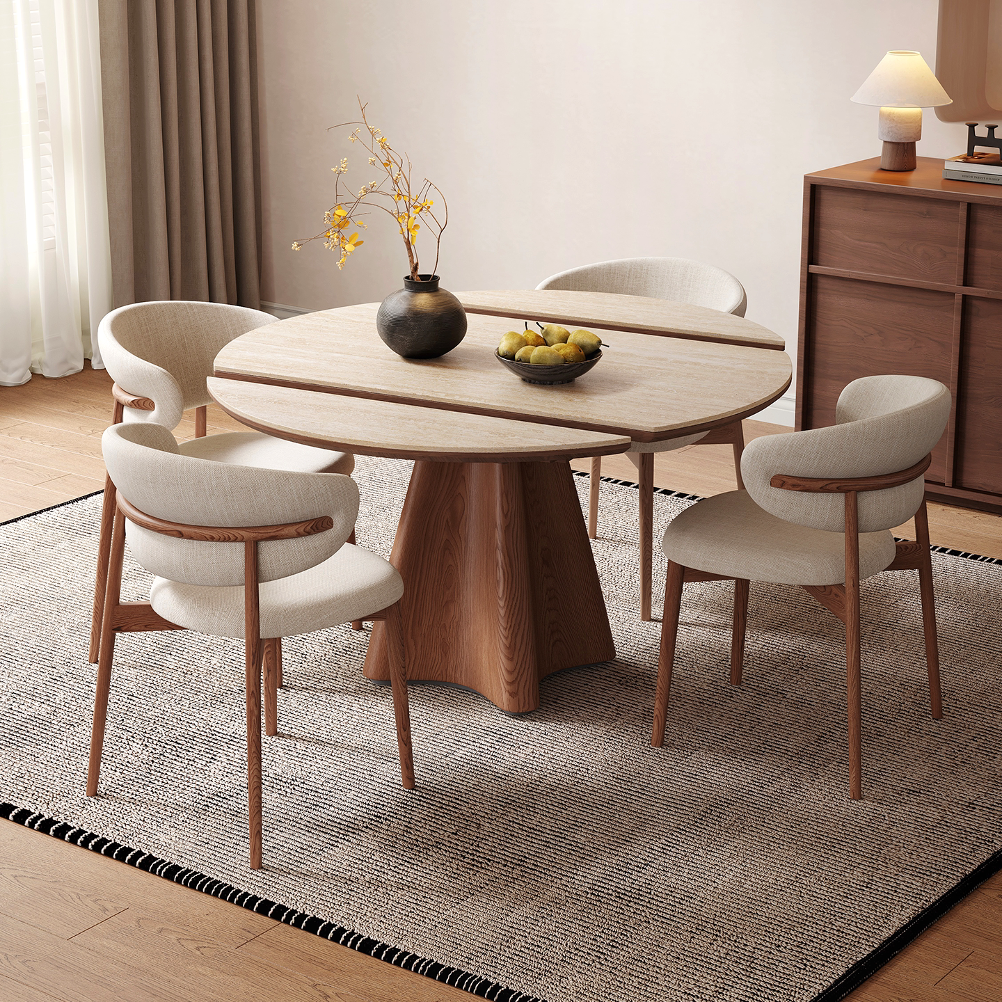 一栖一木洞石岩板实木伸缩餐桌圆形中古风家用小户型圆桌折叠饭桌由