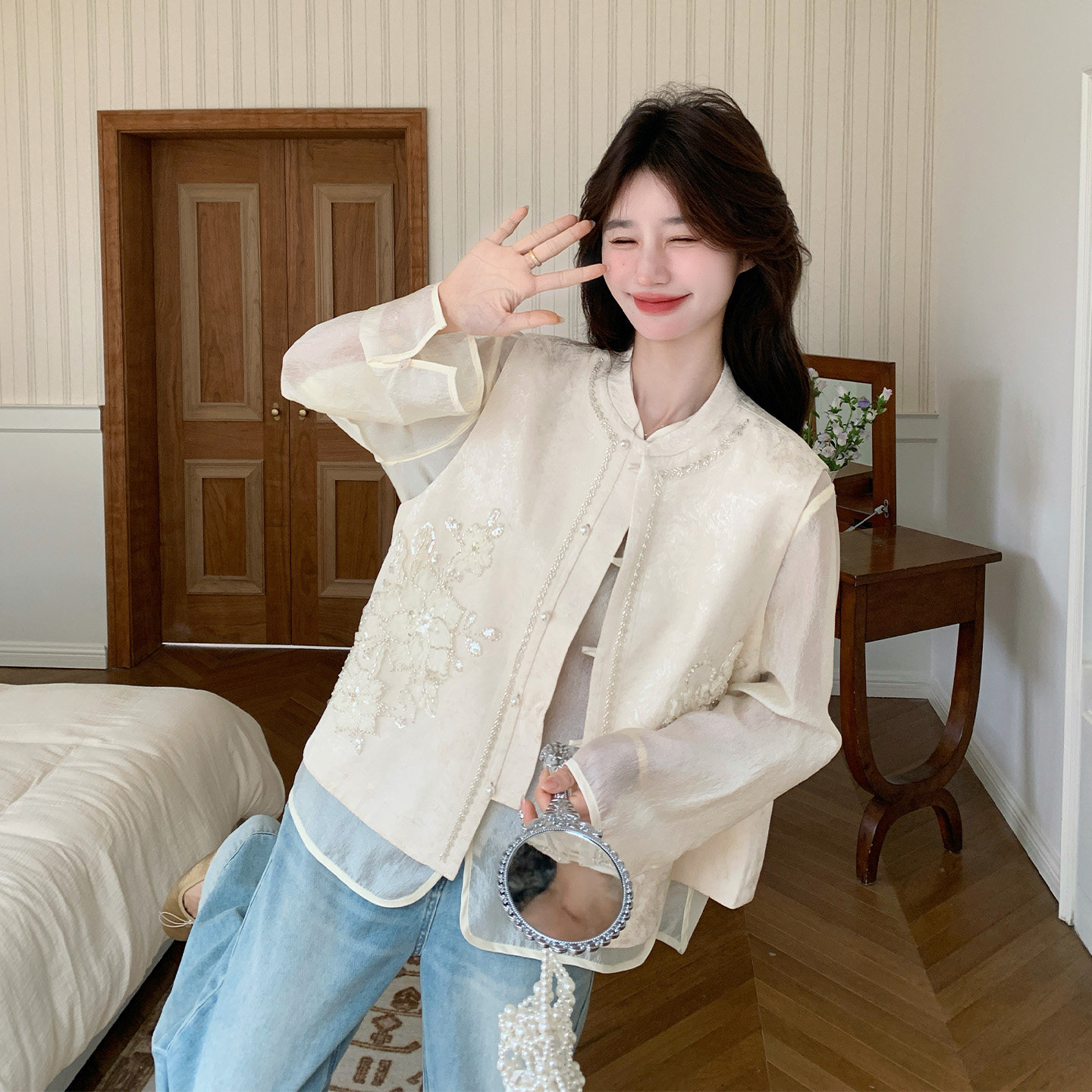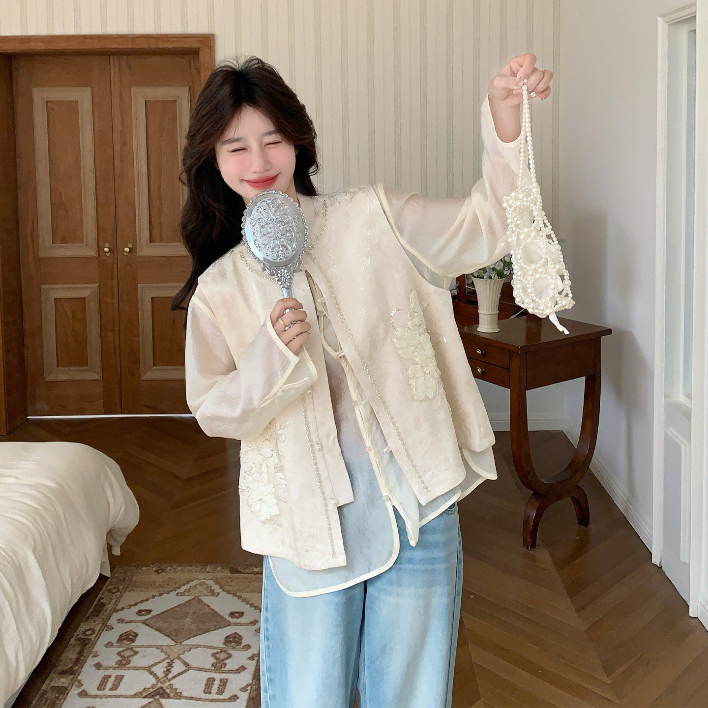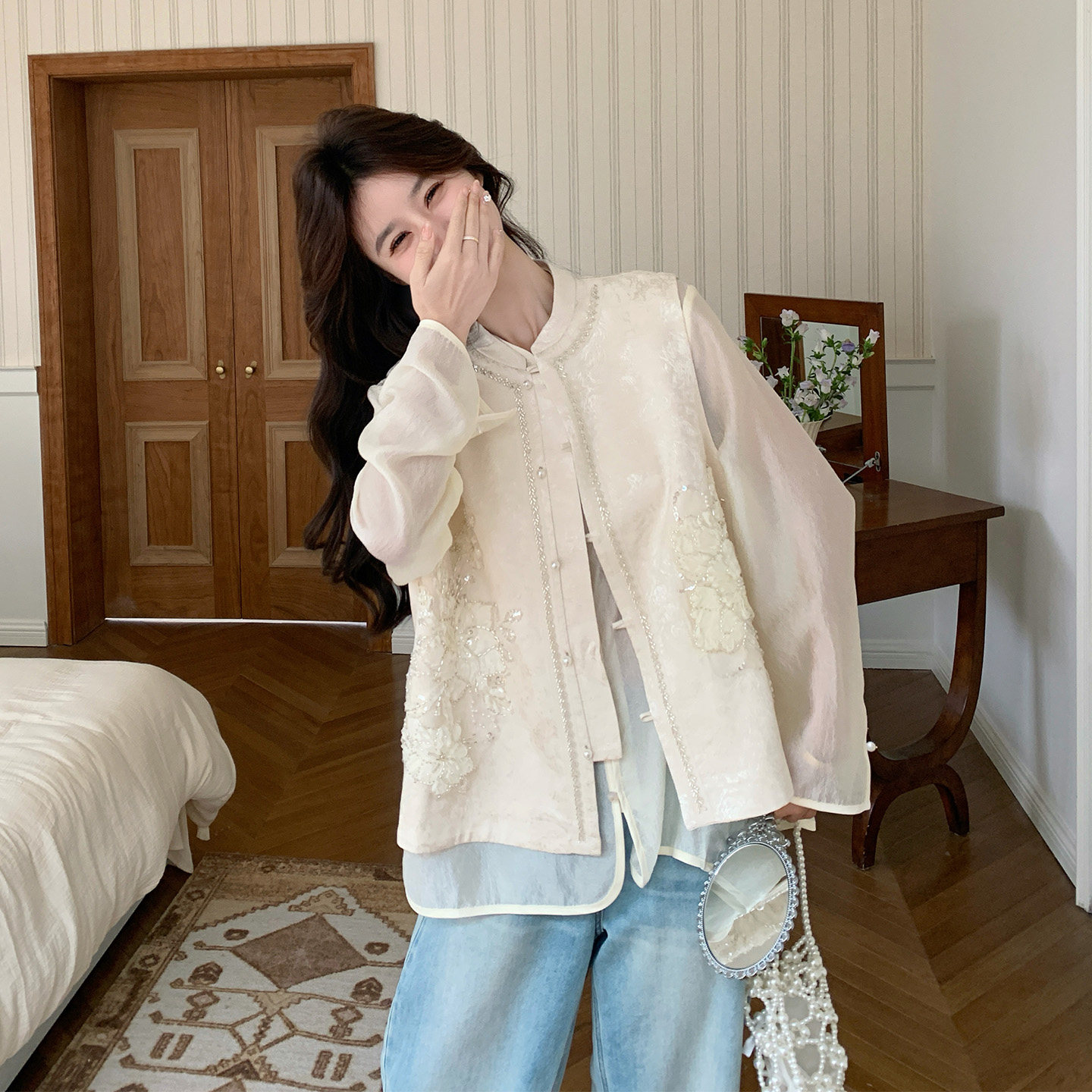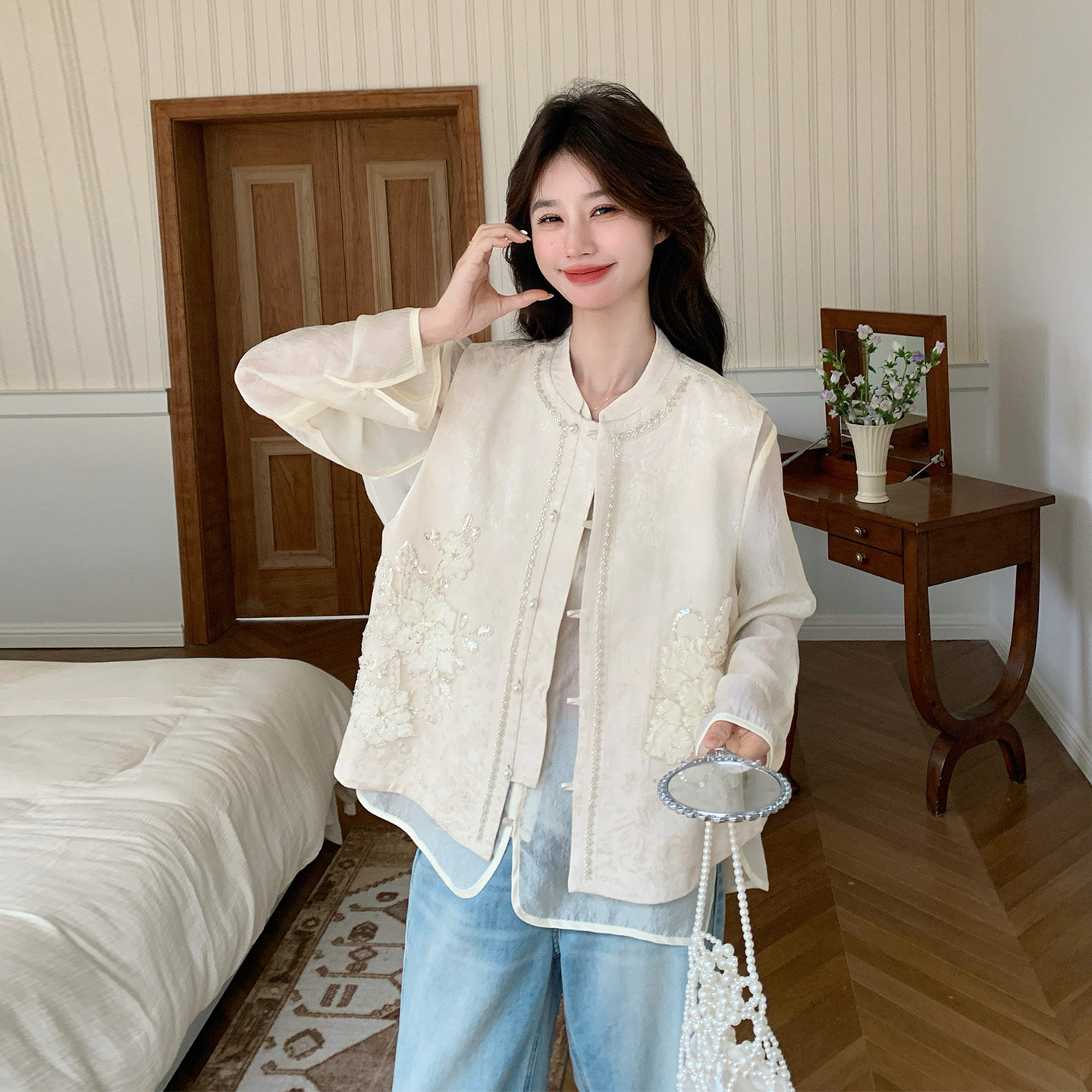 为您提供商品新款 新中式 富家千金感亮片刺绣马甲套装 女2026春季 两件套 气质衬衫的详细介绍,