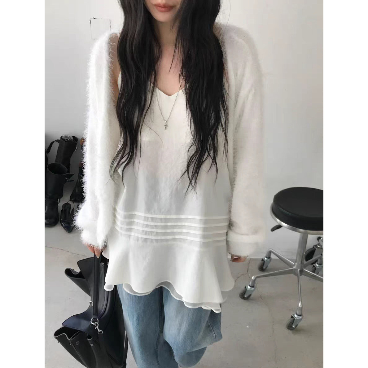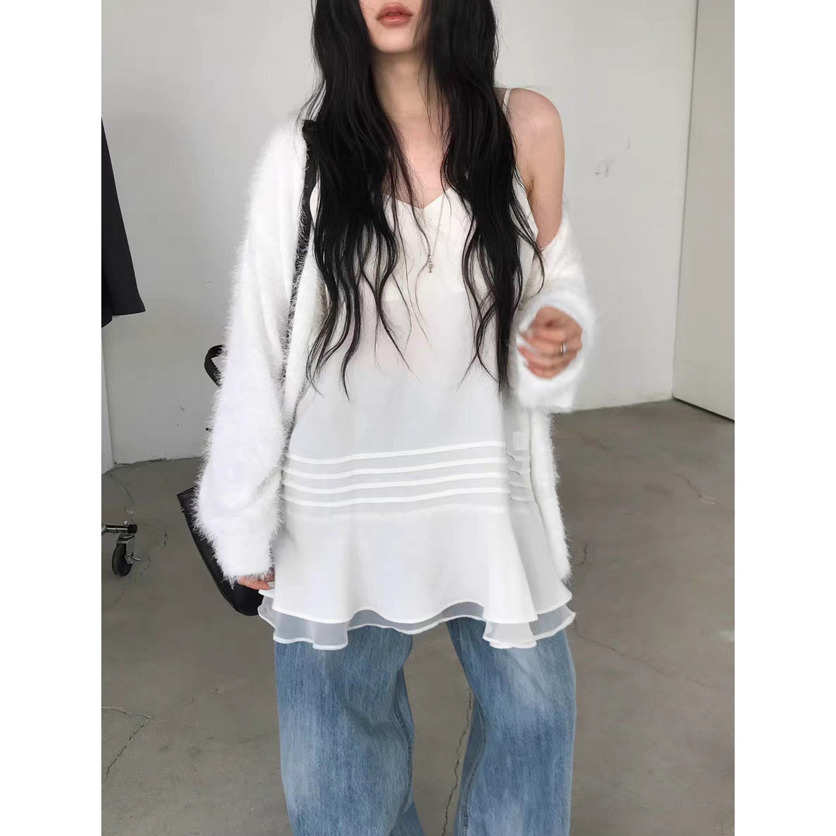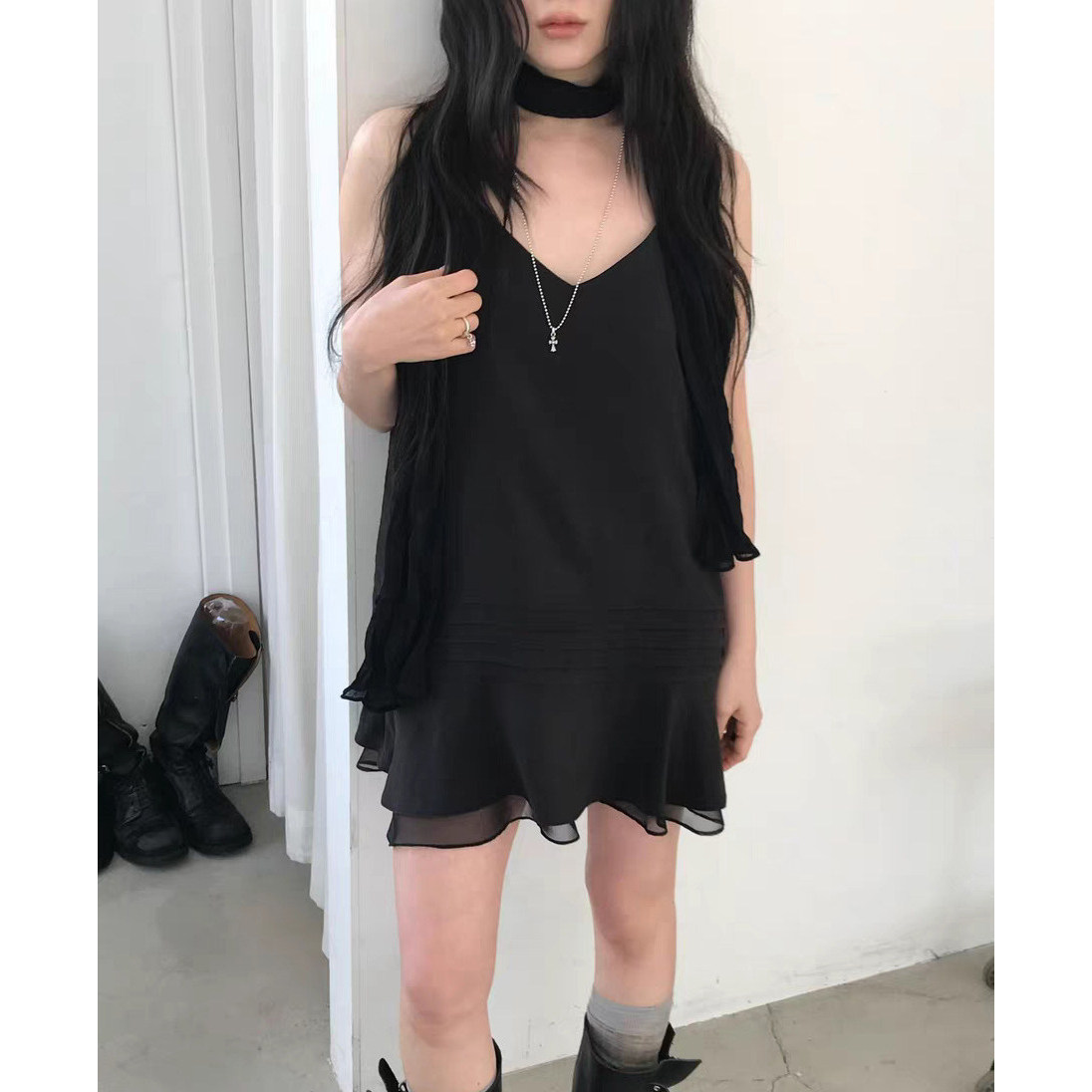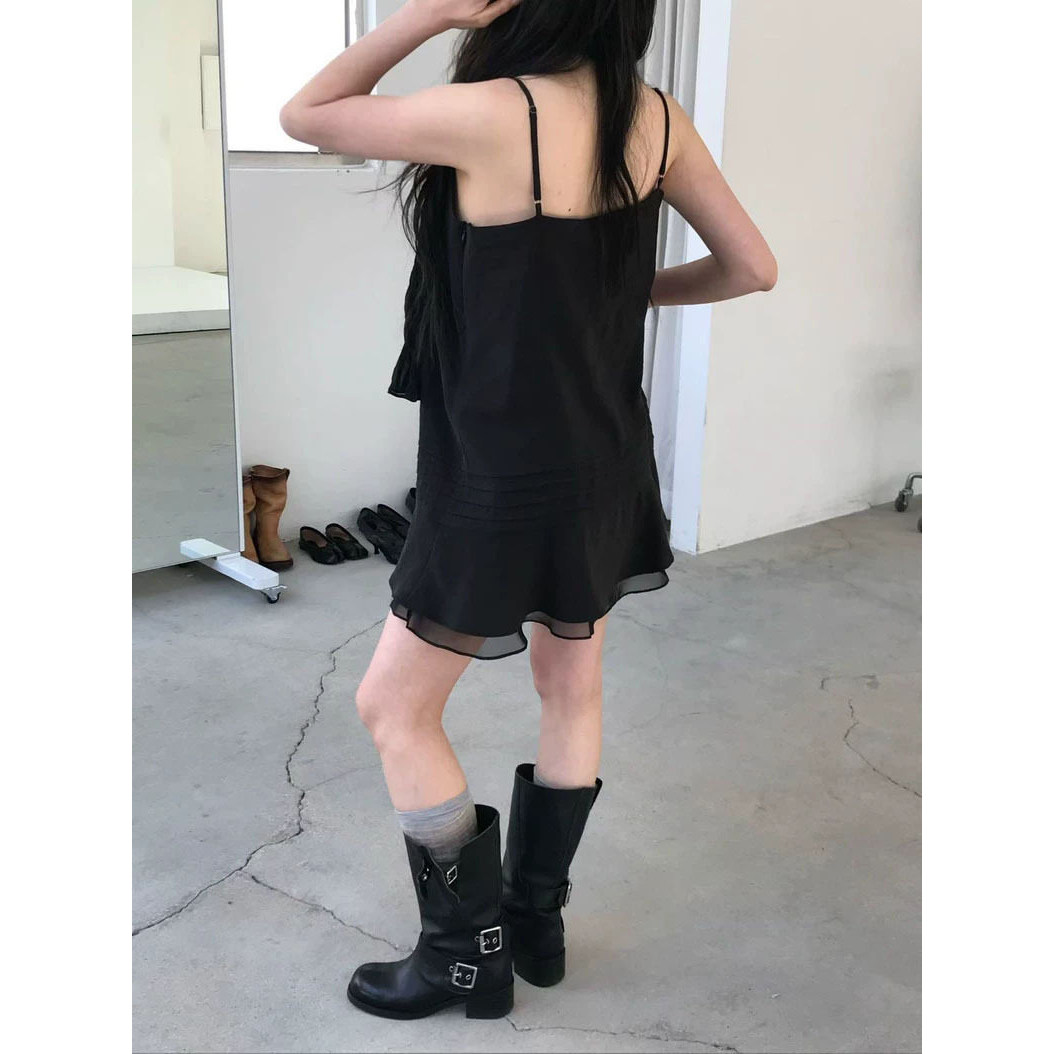 V领吊带裙2026春季 韩国东大门气质纯色双层下摆显瘦连衣裙女 新款