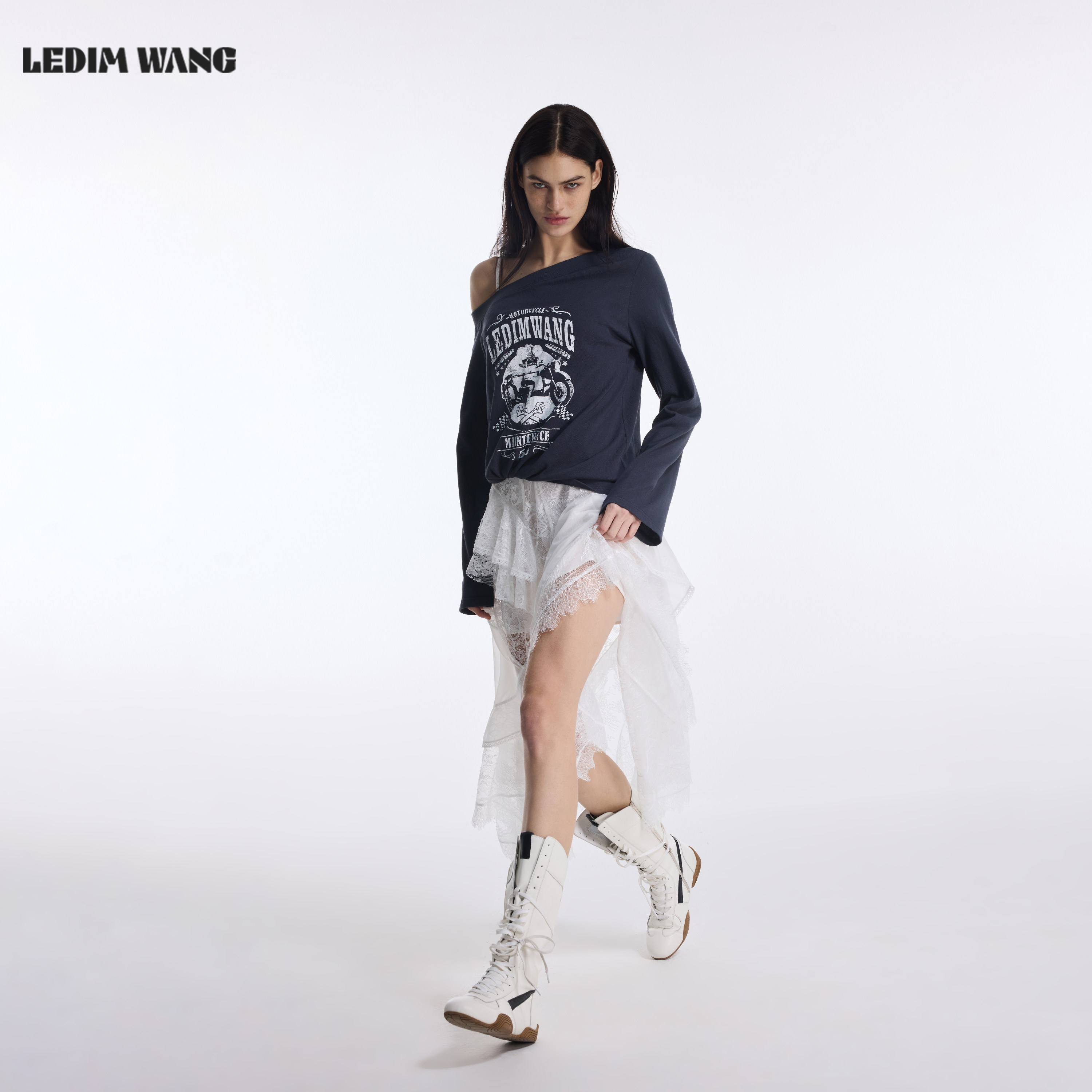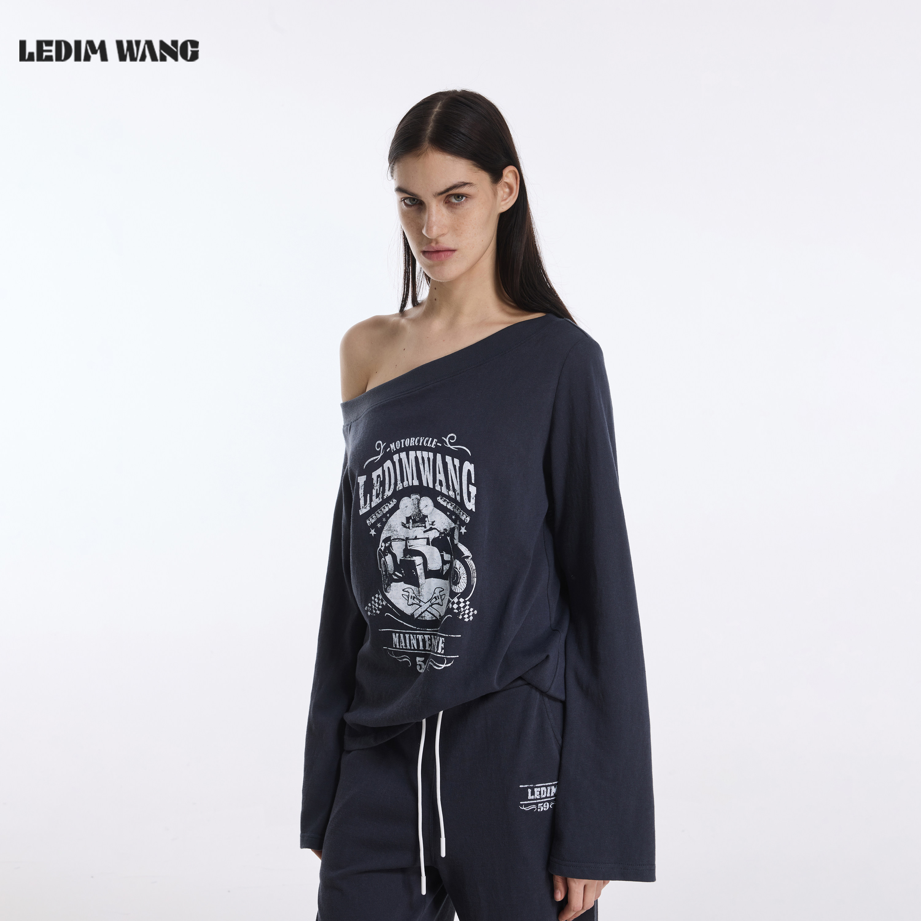 LEDIM 印花斜肩T恤女26春夏新款 深灰色简约长袖 上衣 WANG复古美式由