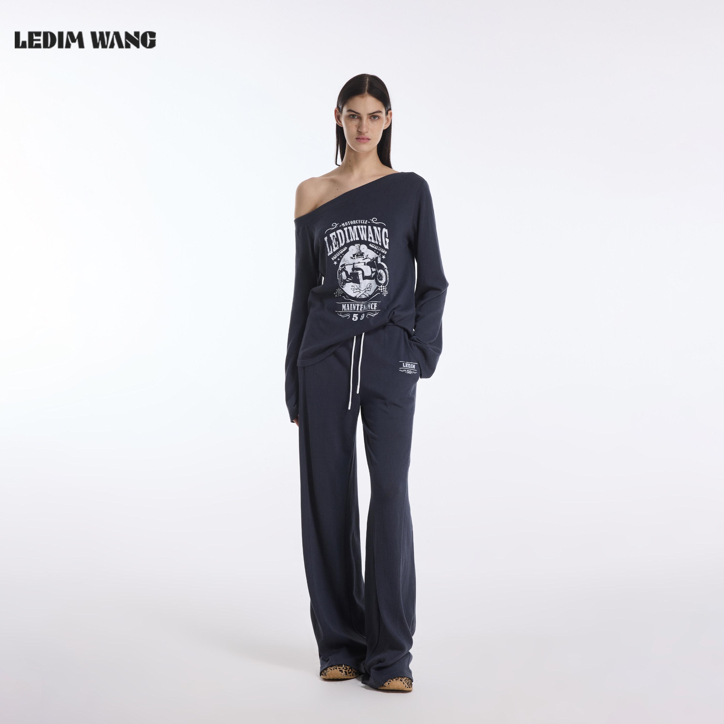 LEDIM 印花斜肩T恤女26春夏新款 深灰色简约长袖 上衣 WANG复古美式