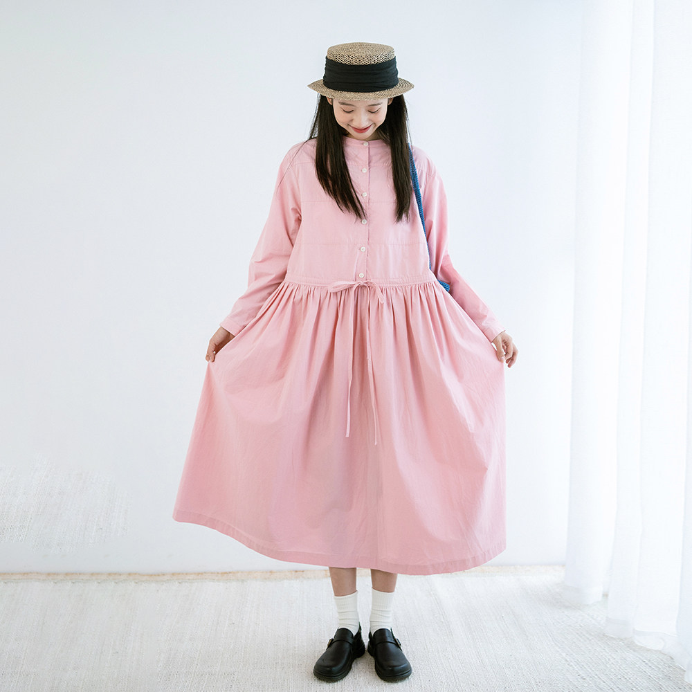 日系文艺慵懒风连衣裙可收腰早秋新款 裙子女 纯棉粉色连衣裙 古苔