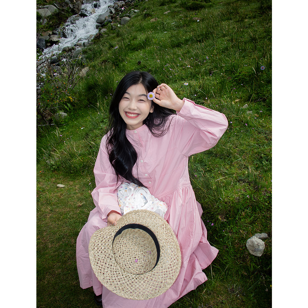 日系文艺慵懒风连衣裙可收腰早秋新款 裙子女 纯棉粉色连衣裙 古苔由