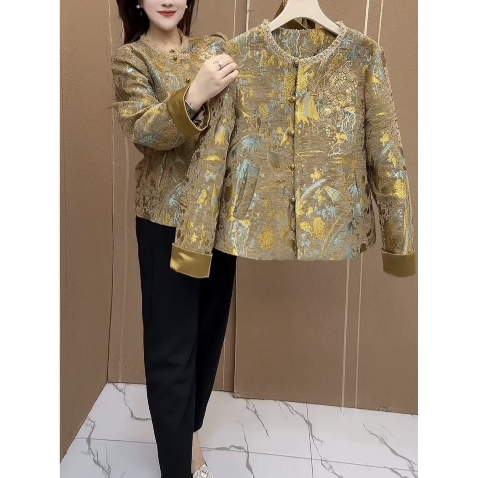 春秋妈妈装 新中式 提花时尚 洋气金色圆领盘扣上衣 网红短外套女新款
