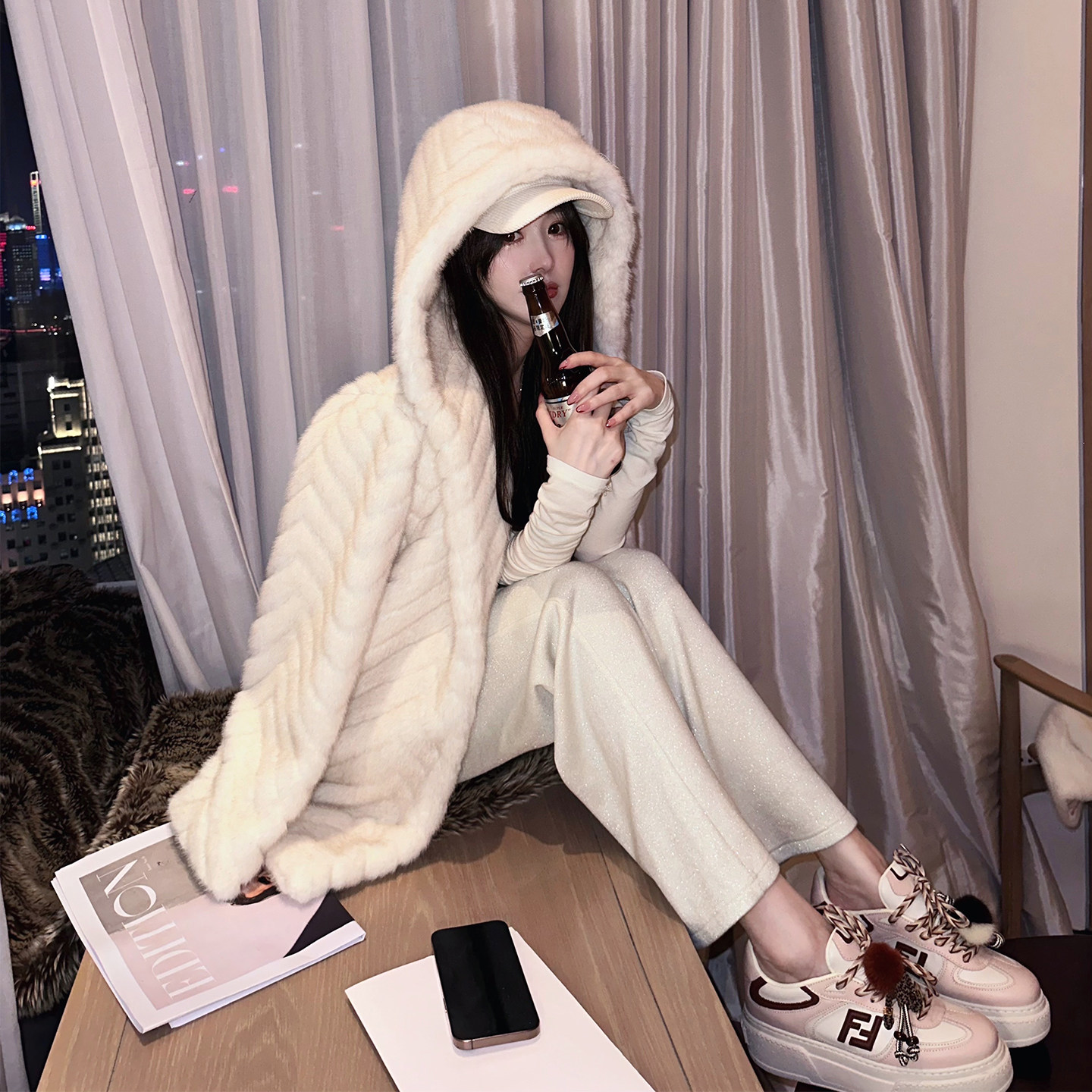 熊熊屋 温柔年轻感人字纹连帽廓形仿貂毛皮草外套 波纹奶酪