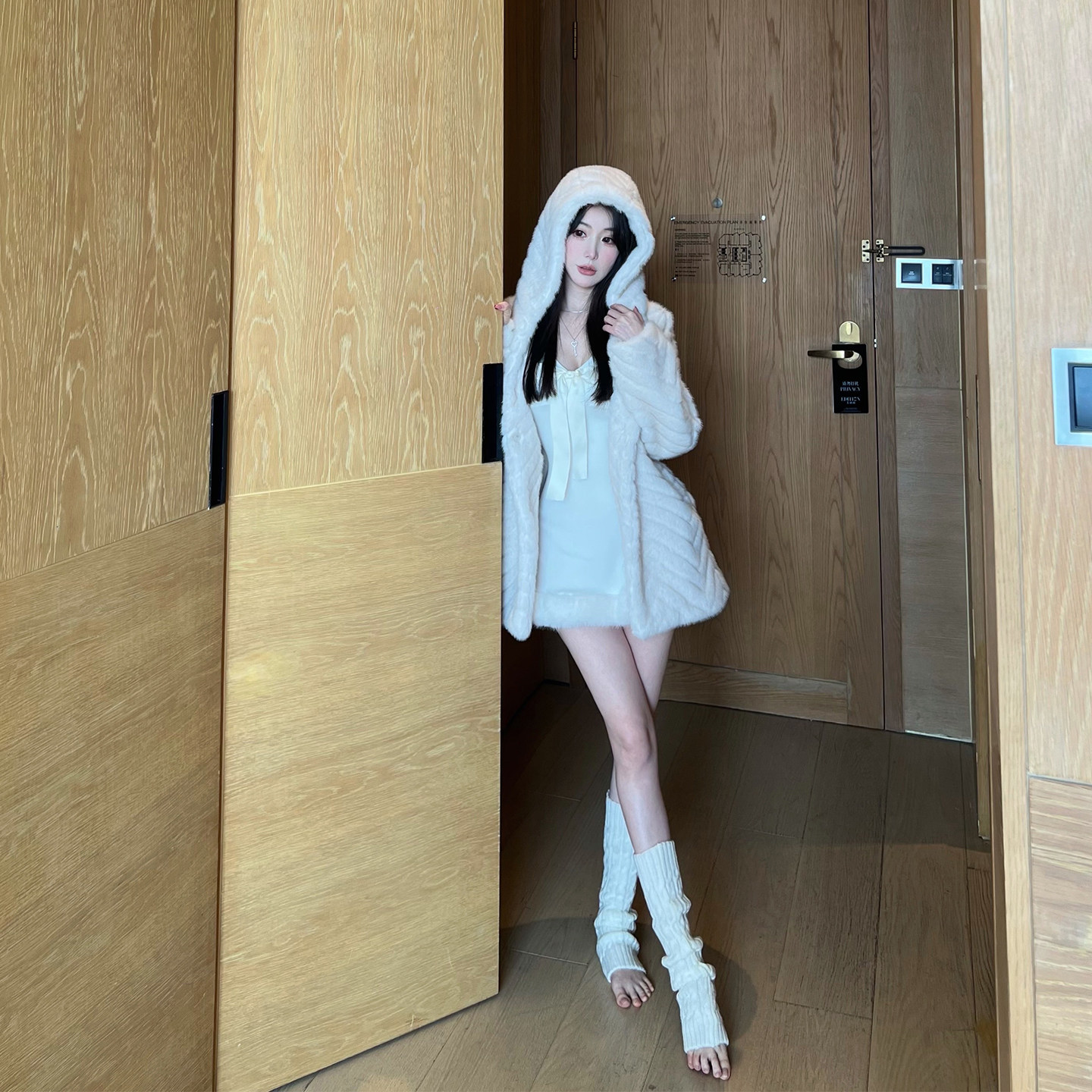 熊熊屋 温柔年轻感人字纹连帽廓形仿貂毛皮草外套 波纹奶酪由