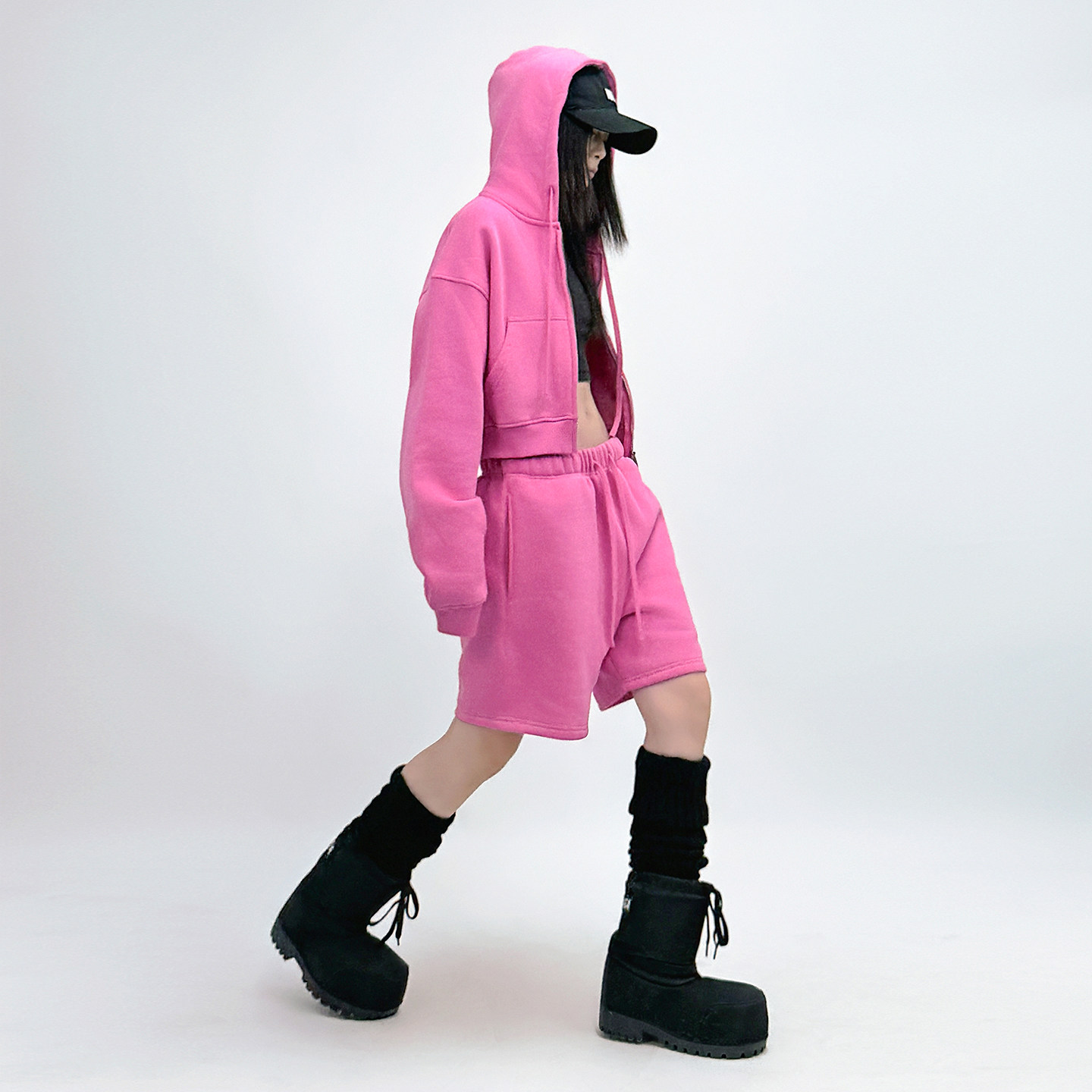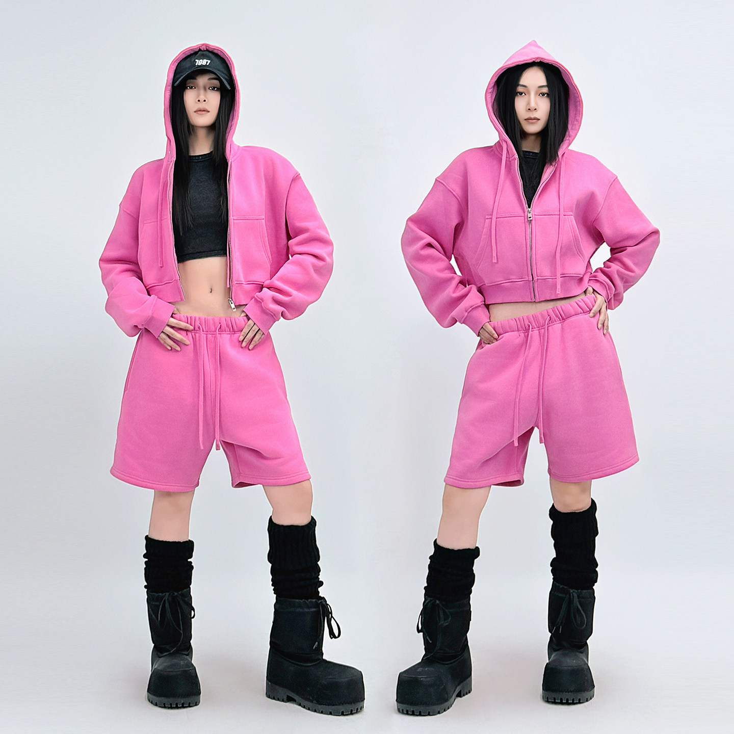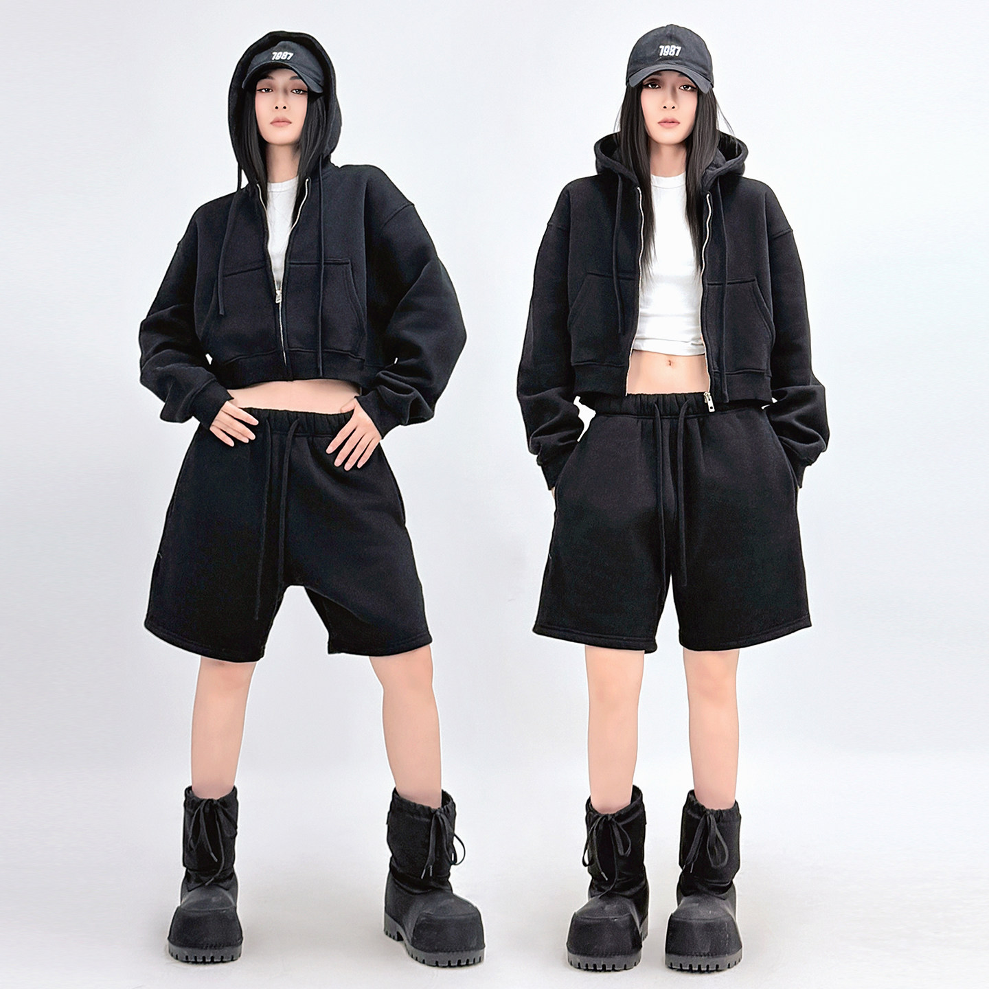 SUN90 潮酷拉链卫衣五分裤 懒人套装 女宽松休闲运动加绒两件套 美式