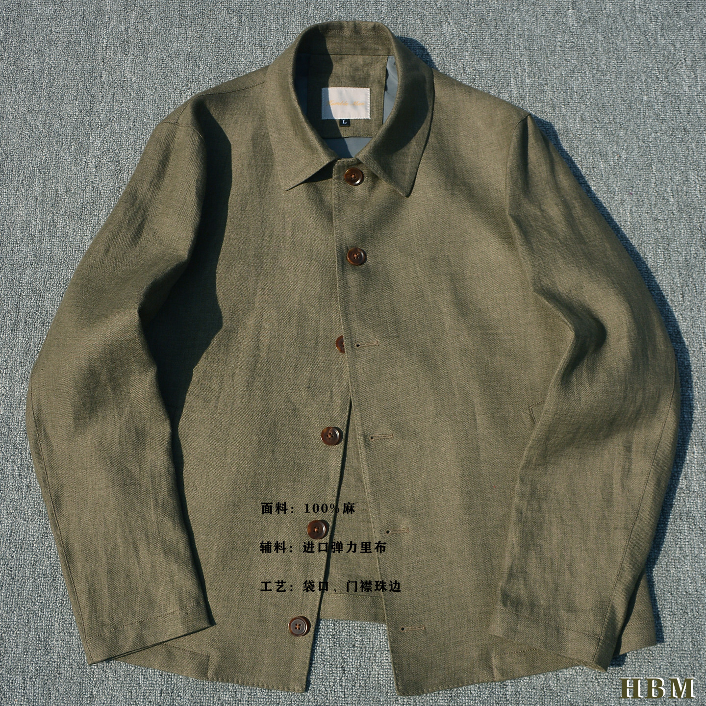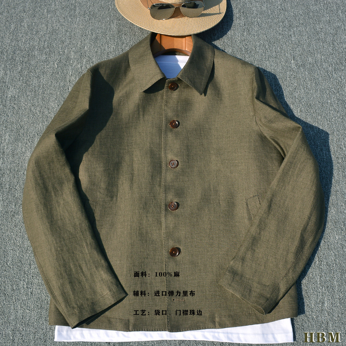 款 短夹克男女 橄榄绿100麻半夹里商务休闲翻领外套纽扣衬衫 HBM新款由