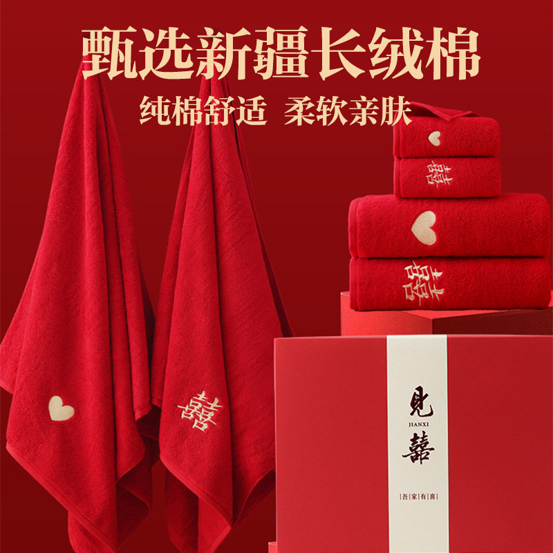 日本进口结婚毛巾浴巾四件套陪嫁一对情侣款 全棉纯棉 红色2025新款由