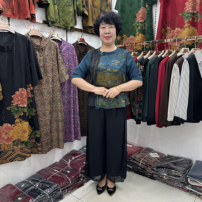 套装 民族风两件套女小个子40岁50拼接真丝t恤旗袍式 中年妈妈夏装由