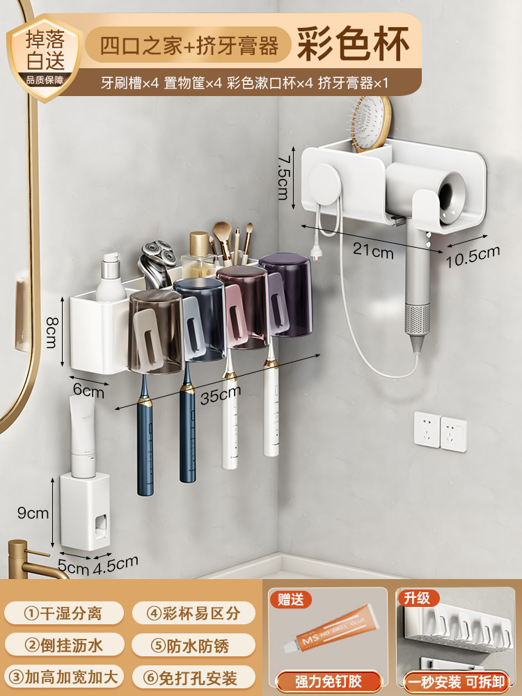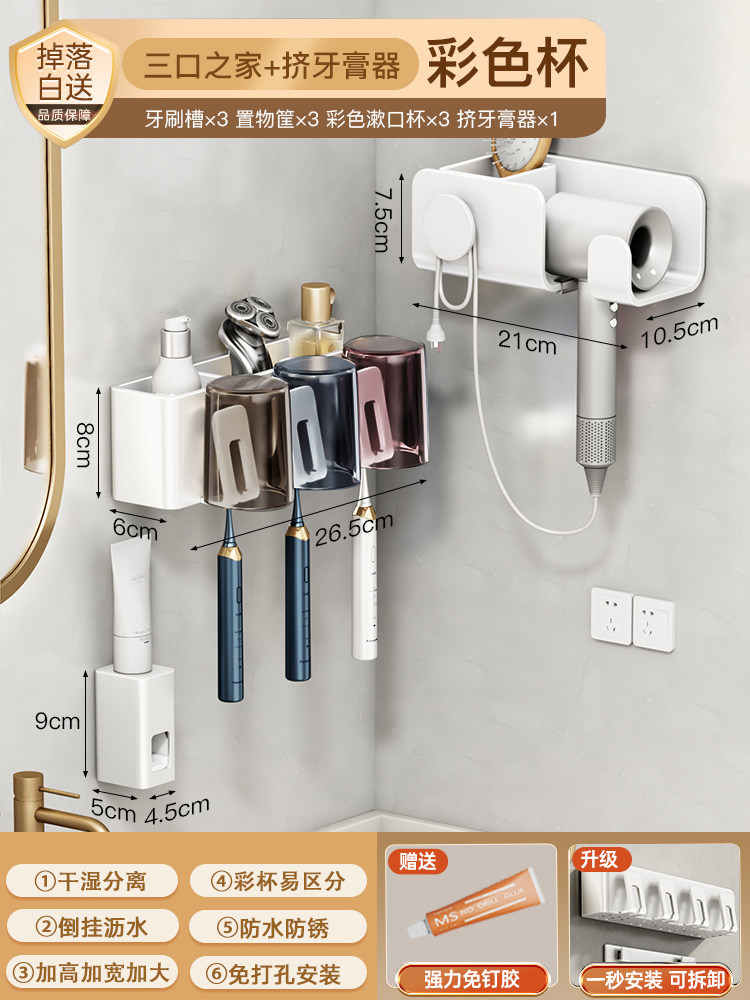 牙杯牙刷置物架子卫生间电动白色漱口免打孔家庭吹风机架壁挂墙式由