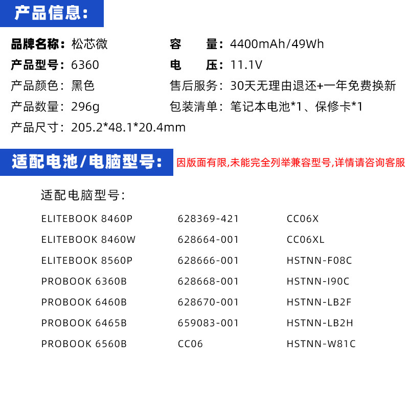 为您提供商品适用于惠普 8560p 8460w 6465b 6360b 6560b 6460b 8470P 8570p笔记本电脑电池 CC06 8460p的详细介绍,