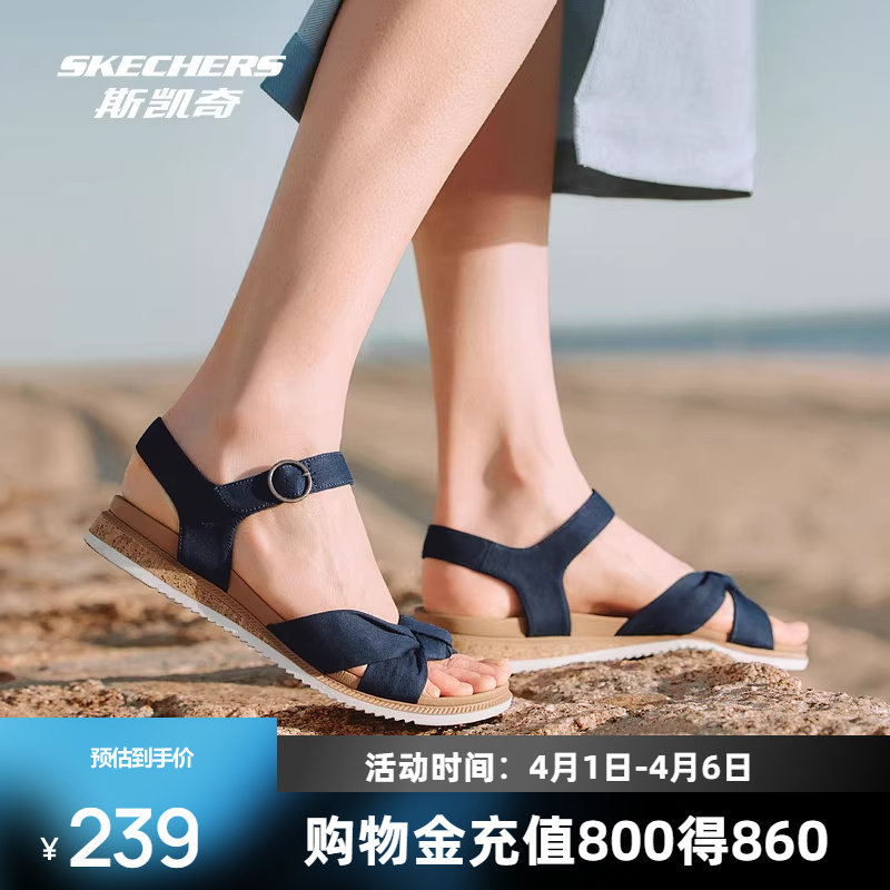 新品 斯凯奇女士时尚 沙滩凉鞋 夏季 海军蓝黑色纽带蝴蝶结沙滩鞋