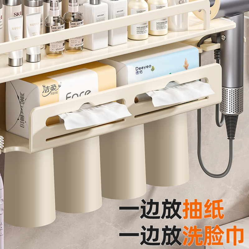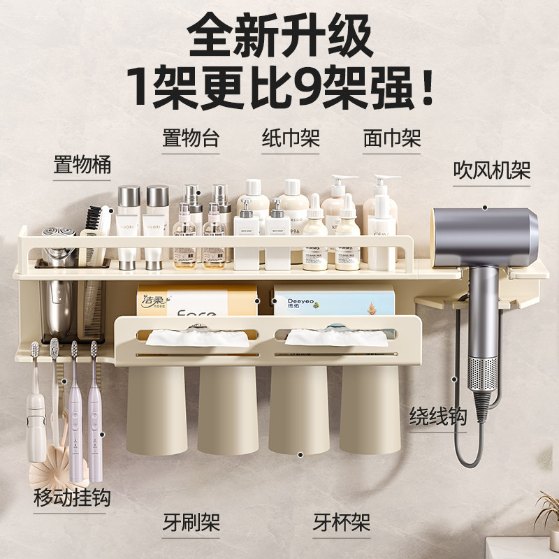 卫生间吹风机置物架免打孔浴室漱口杯架 奶白磁吸电动牙刷架壁挂式由