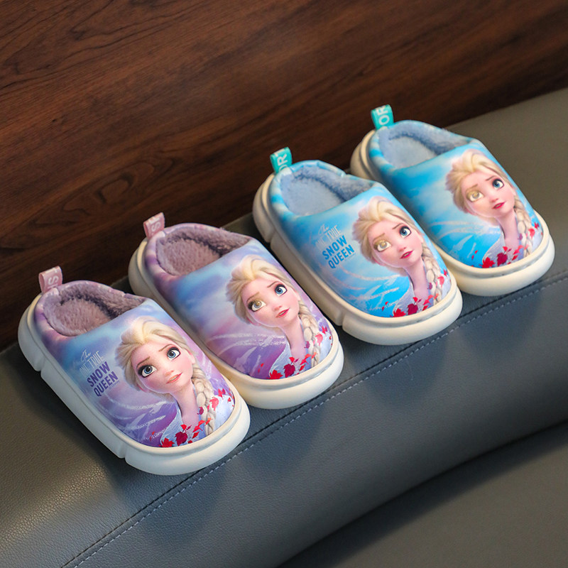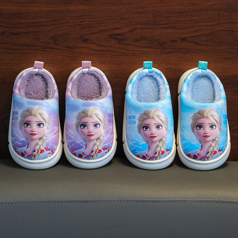 儿童室内pu皮面防水棉鞋 艾莎公主女童毛毛绒 冬季 极速小女孩棉拖鞋