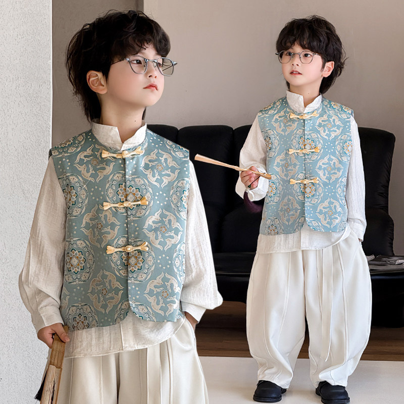衬衫 儿童新中式 国风马甲春夏季 男童唐装 洋气男孩走秀演出礼服 套装