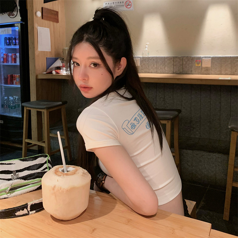 T恤女ins正肩修身 显瘦弹力露脐上衣潮 春夏梵文印花纯欲短袖 樊樊由