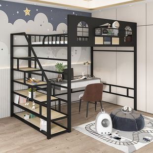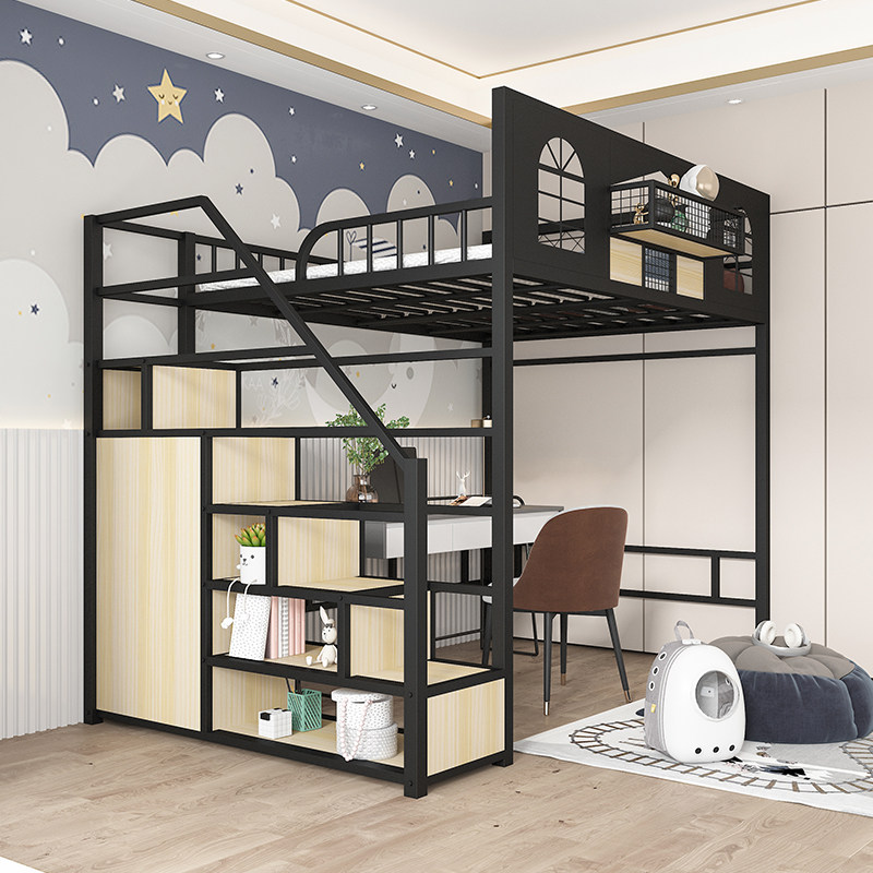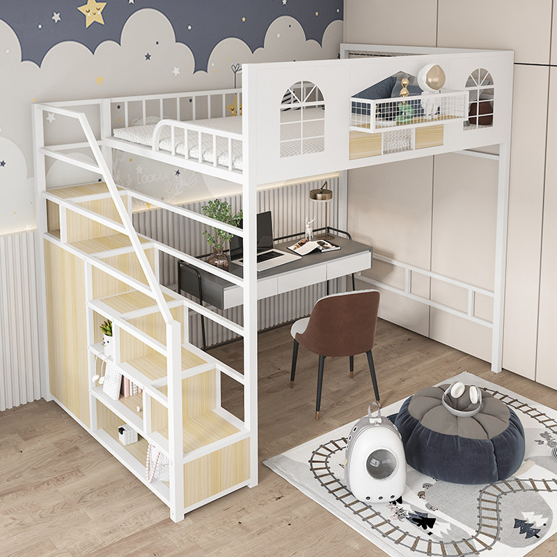 小户型儿童上床下桌衣柜铁艺高架钢木床金属护栏多功能组合床定制