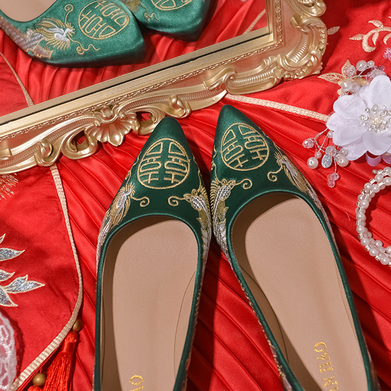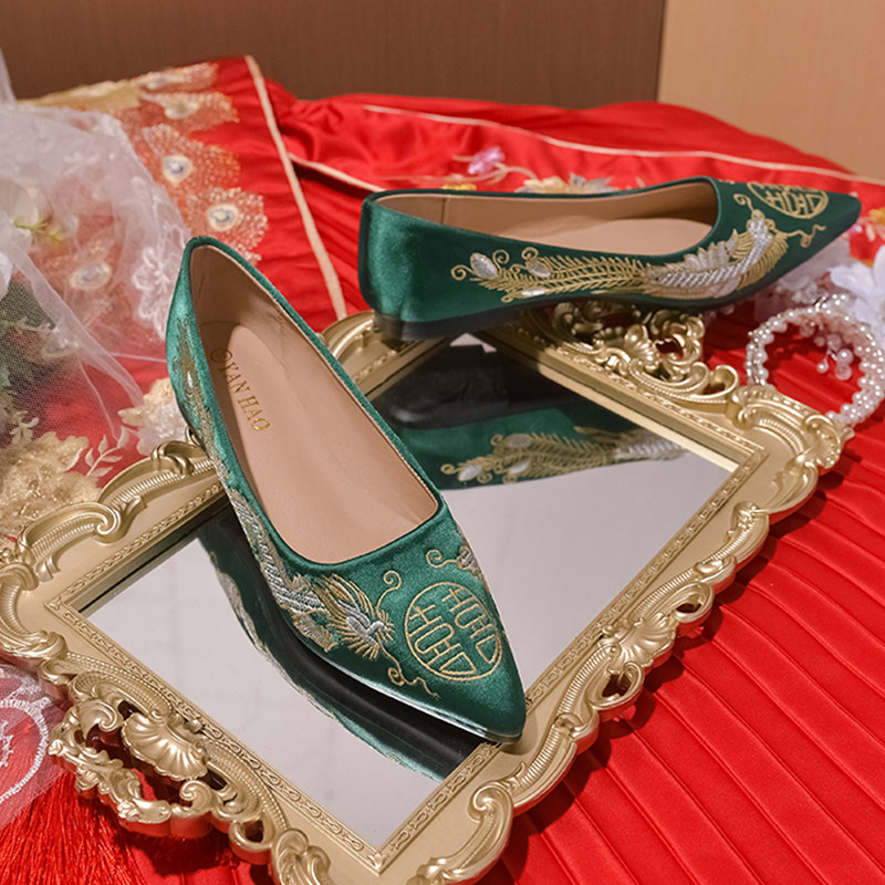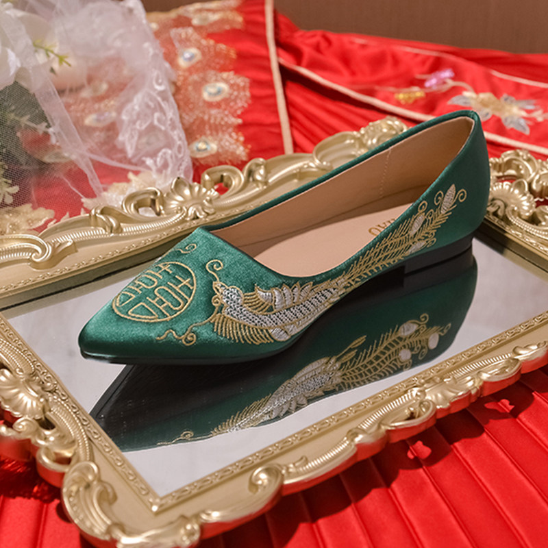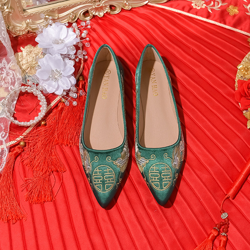 秀禾鞋 绿色婚鞋 尖头浅口单鞋 大码 女结婚新娘出门上车鞋 平底孕妇鞋