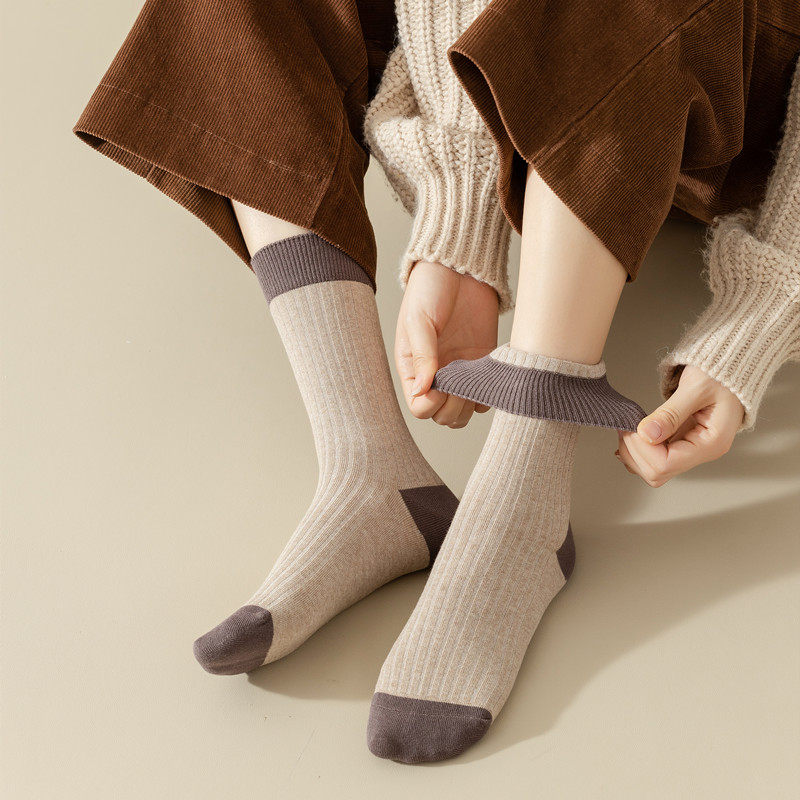 波点木耳边月子袜女 奶白色中筒袜子女春夏百搭纯色堆堆袜长袜韩版