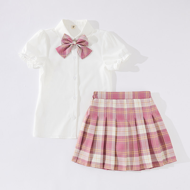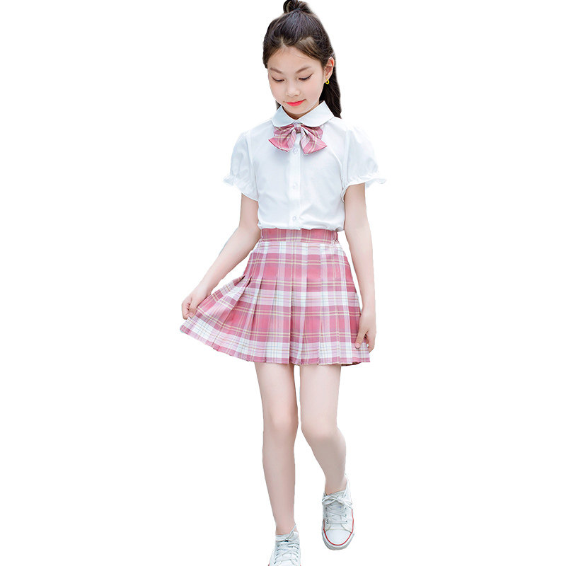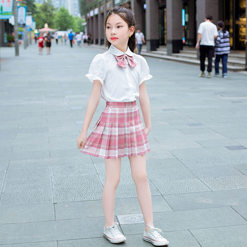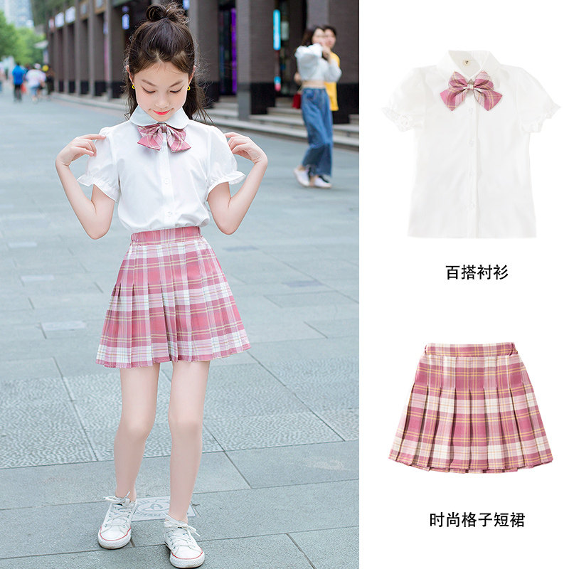 网红洋气短裙两件套中大童JK制服学院风半身裙12岁 女童百褶裙套装由