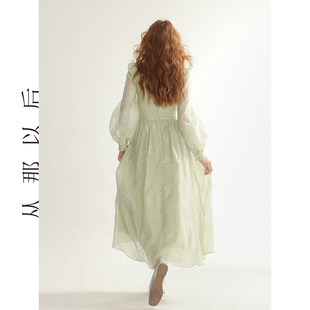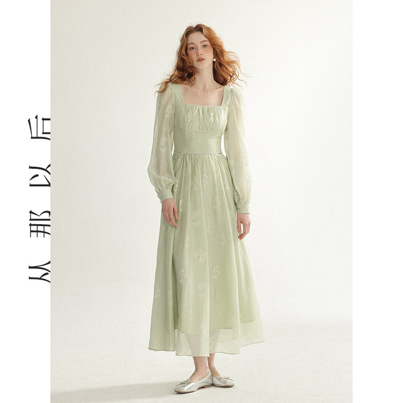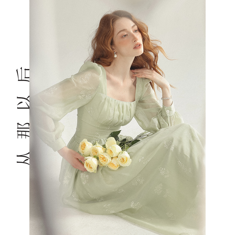 连衣裙早秋长裙公主茶歇裙子女秋季 风碎花裙绿色长袖 从那以后法式