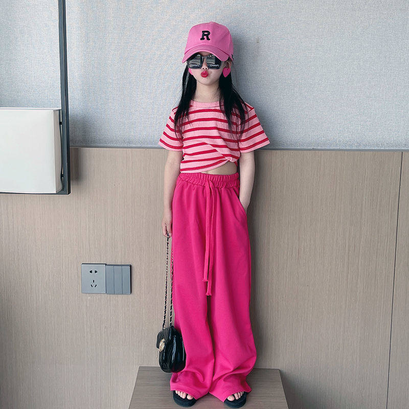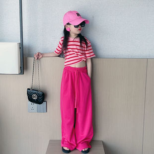 中大童条纹上衣炸街阔腿裤 女童套装 夏装 2026新款 洋气潮 两件套时尚