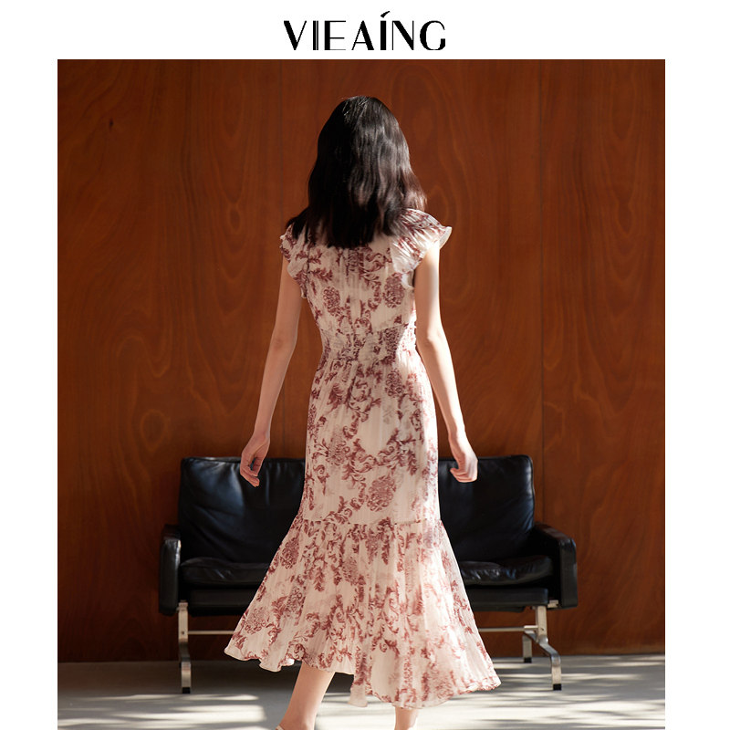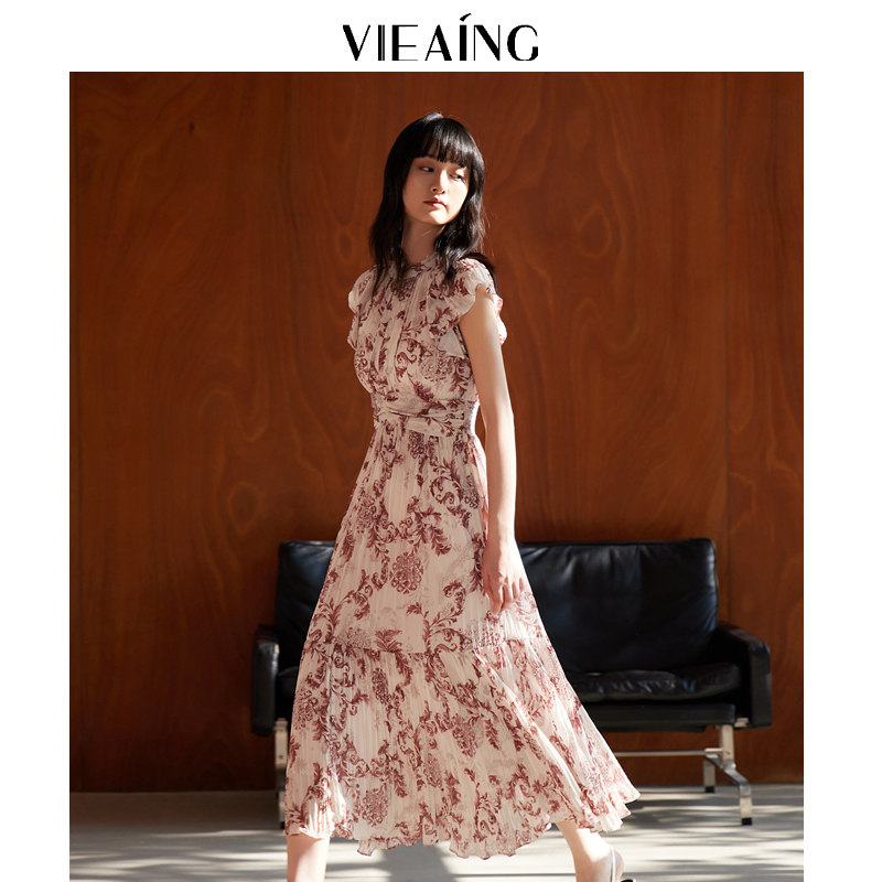 VIEA.ING薇迎粉色连衣裙女2026夏新款 碎花a字度假裙子长裙 小飞袖