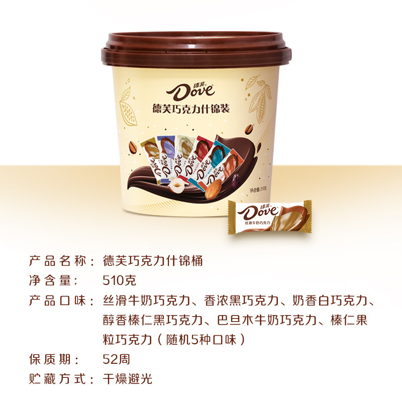 德芙巧克力6g什锦桶510g混合口味丝滑牛奶香浓黑巧办公室零食桶装由