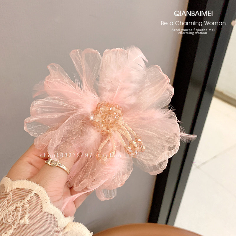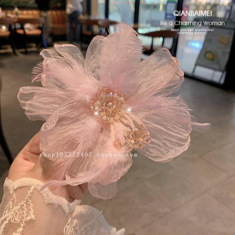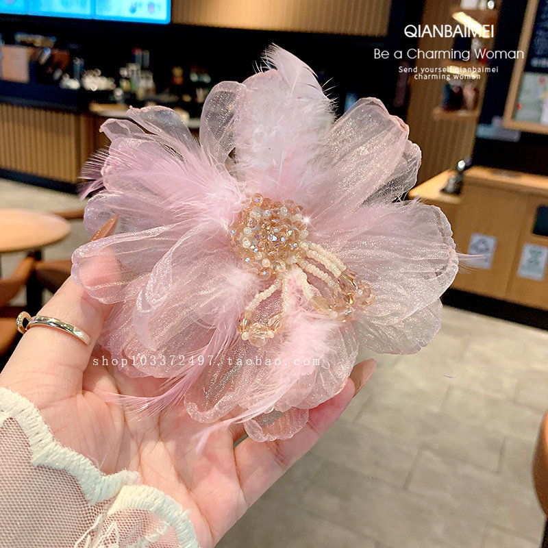 超仙欧根纱大号花朵发夹氛围感发饰羽毛水晶串珠流苏侧边夹鸭嘴夹由