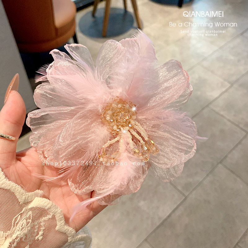 为您提供商品超仙欧根纱大号花朵发夹氛围感发饰羽毛水晶串珠流苏侧边夹鸭嘴夹的详细介绍,