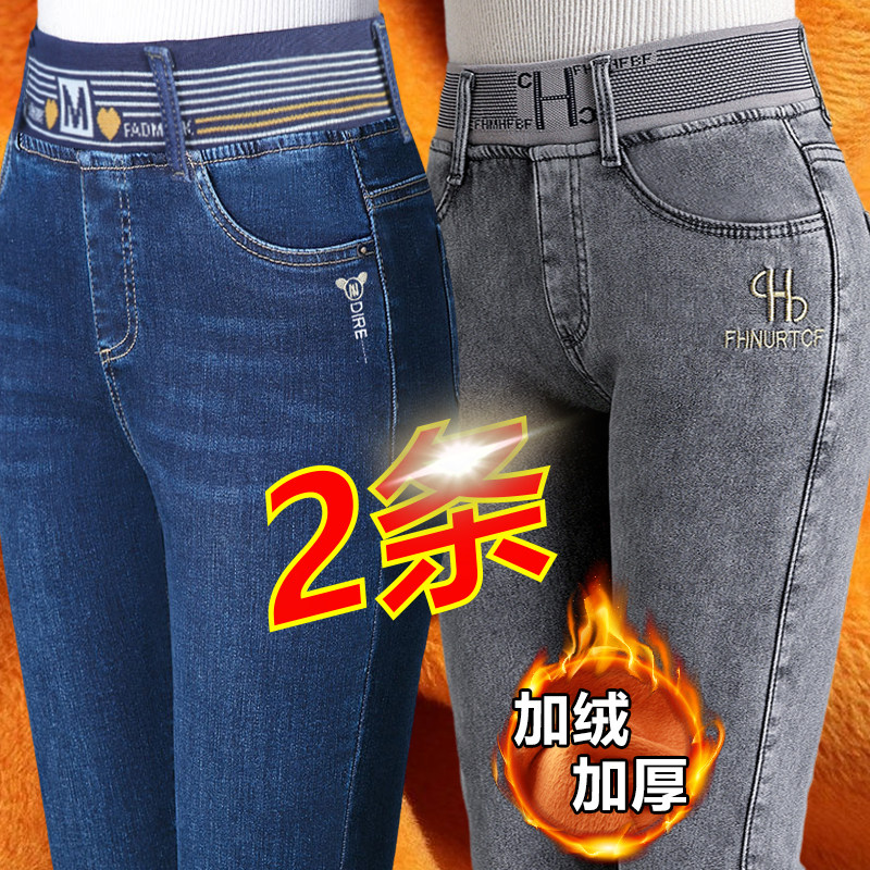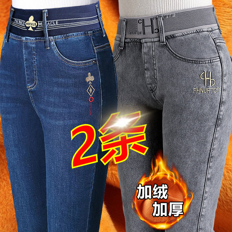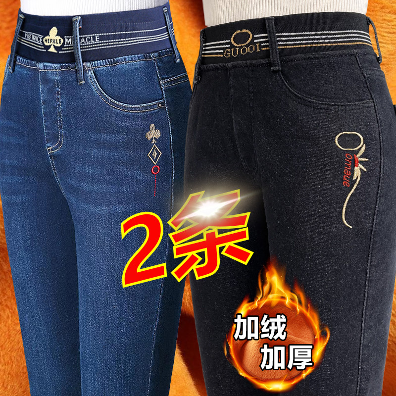 中老年大码 加绒牛仔长裤 女冬季 高腰加厚带绒松紧腰直筒裤 保暖 女裤