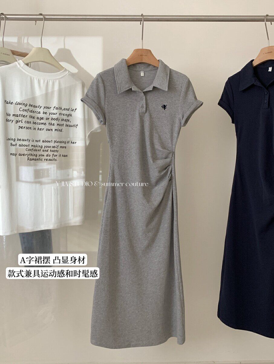 2025年夏季 气质减龄刺绣一侧褶皱polo领短袖 长款 连衣裙女夏 新款