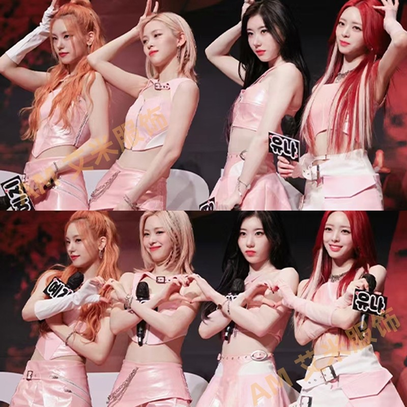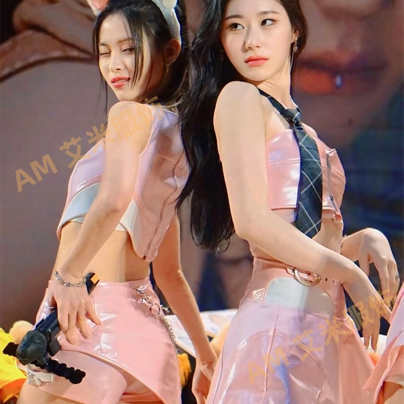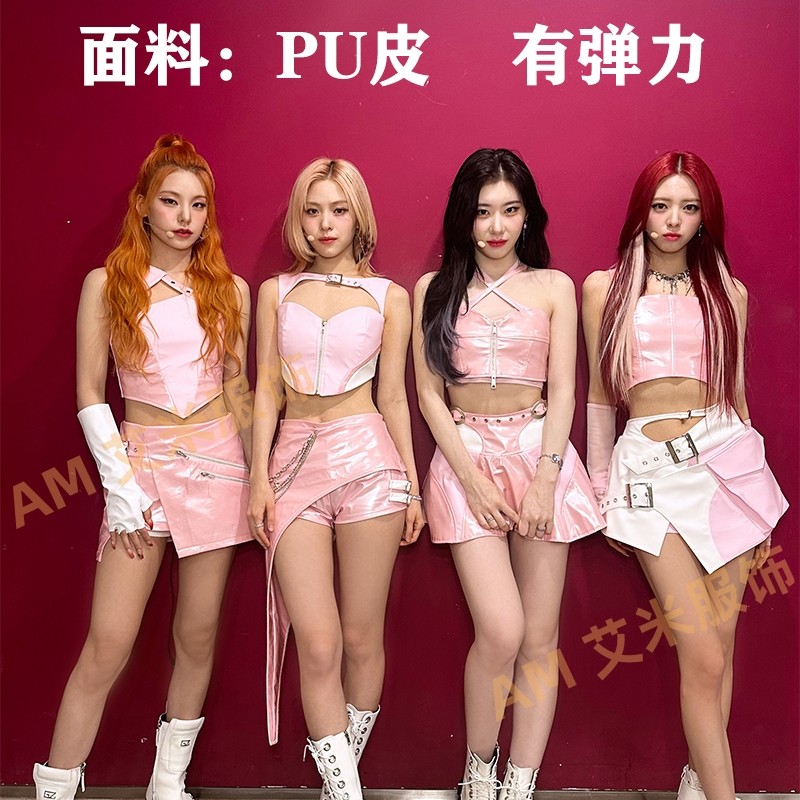 ITZY女团粉色套装 裙性感学生打歌服 舞台爵士舞蹈表演服KPOP皮短裤