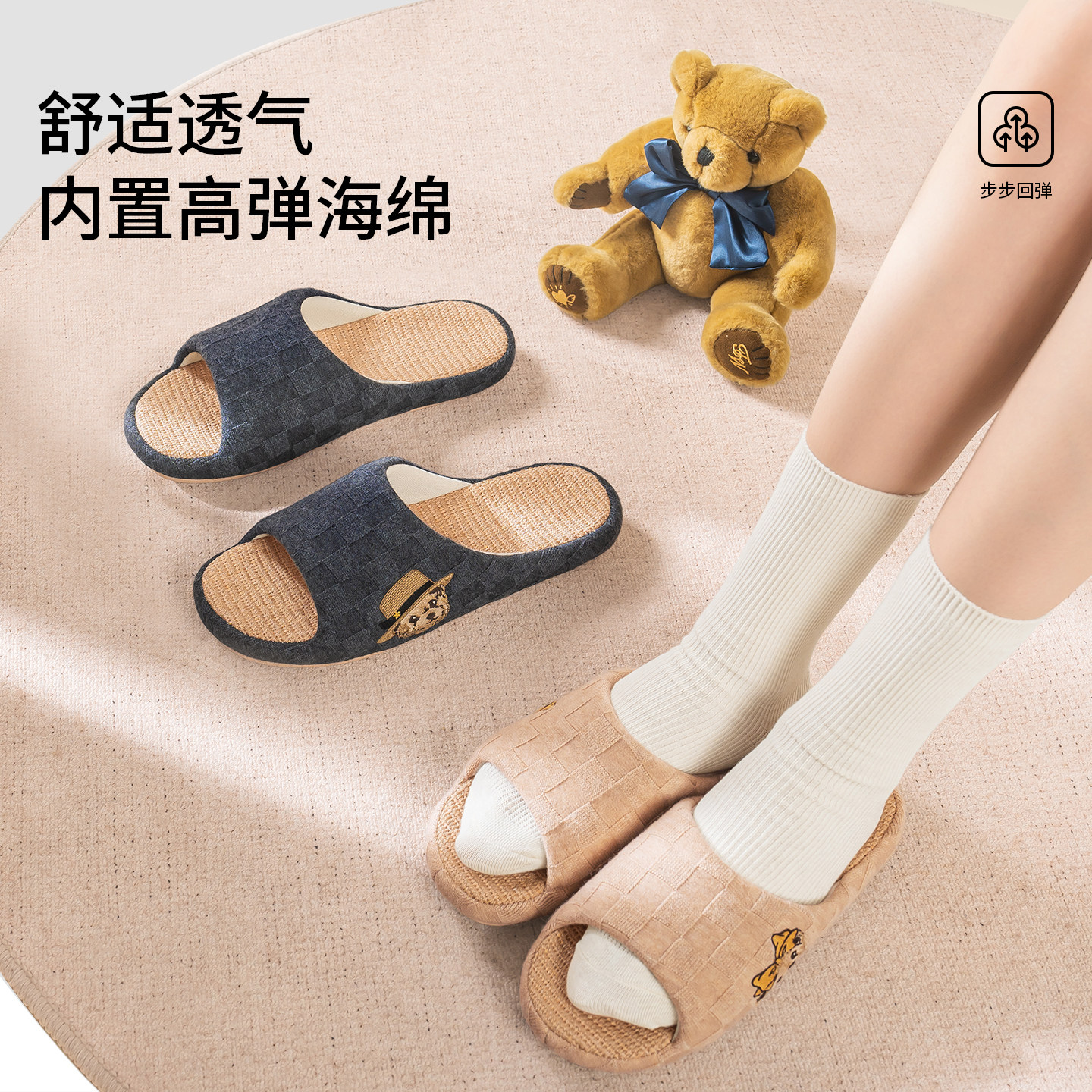 室内棉麻鞋 子 居家男女情侣刺绣防滑冬季 TeenieWeenie小熊亚麻拖鞋由