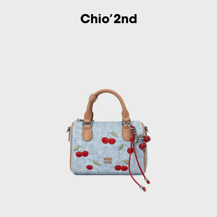 甜心樱桃手提包包女士牛仔蓝波士顿包超火上班小拎包 南风Chio2nd由