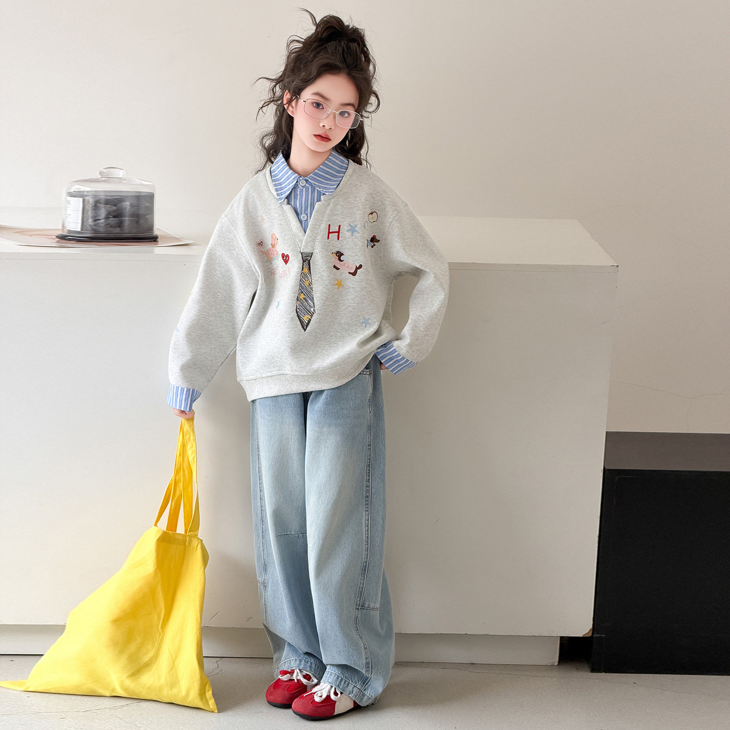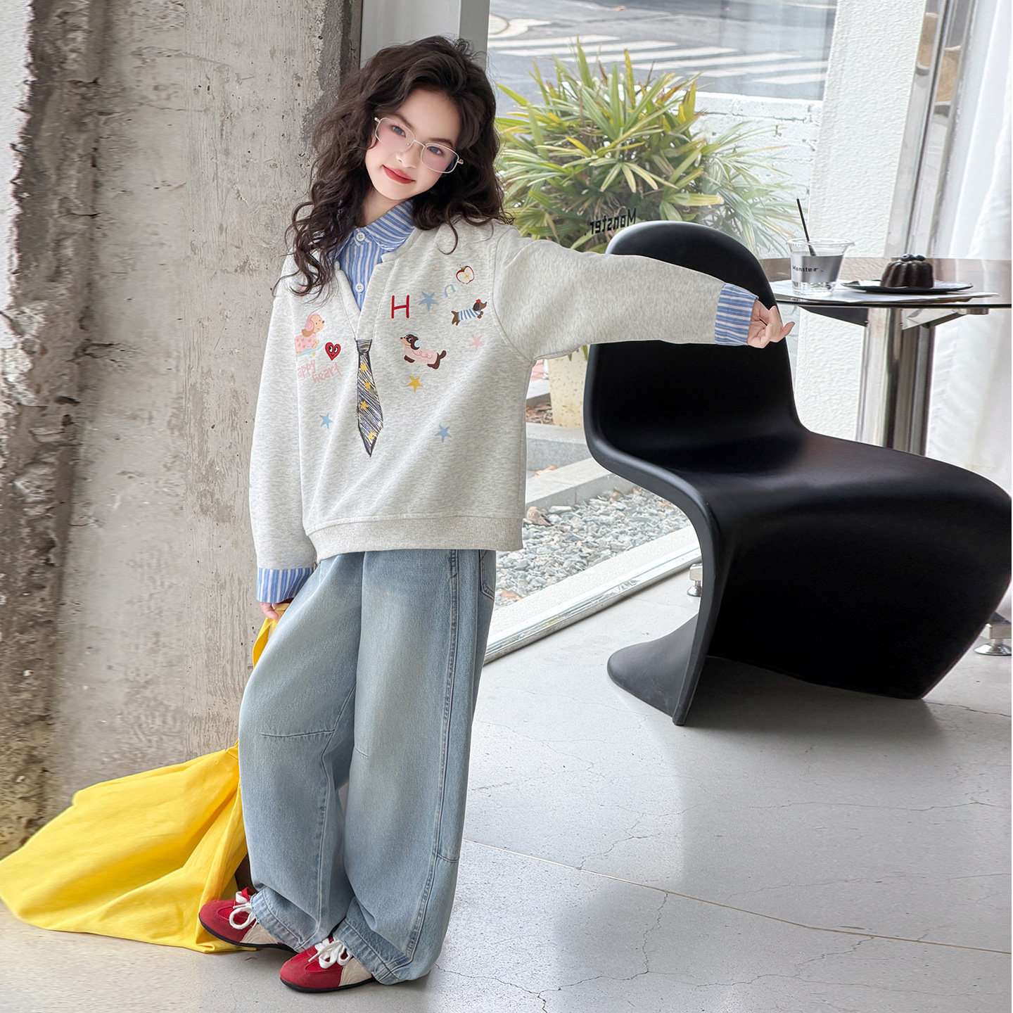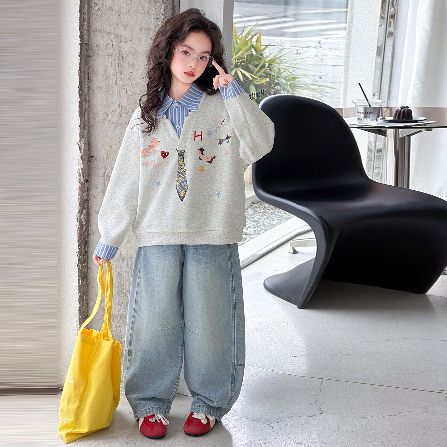 洋气儿童装 女童春装 假两件卫衣套装 2026新款 两件套 女孩休闲牛仔裤