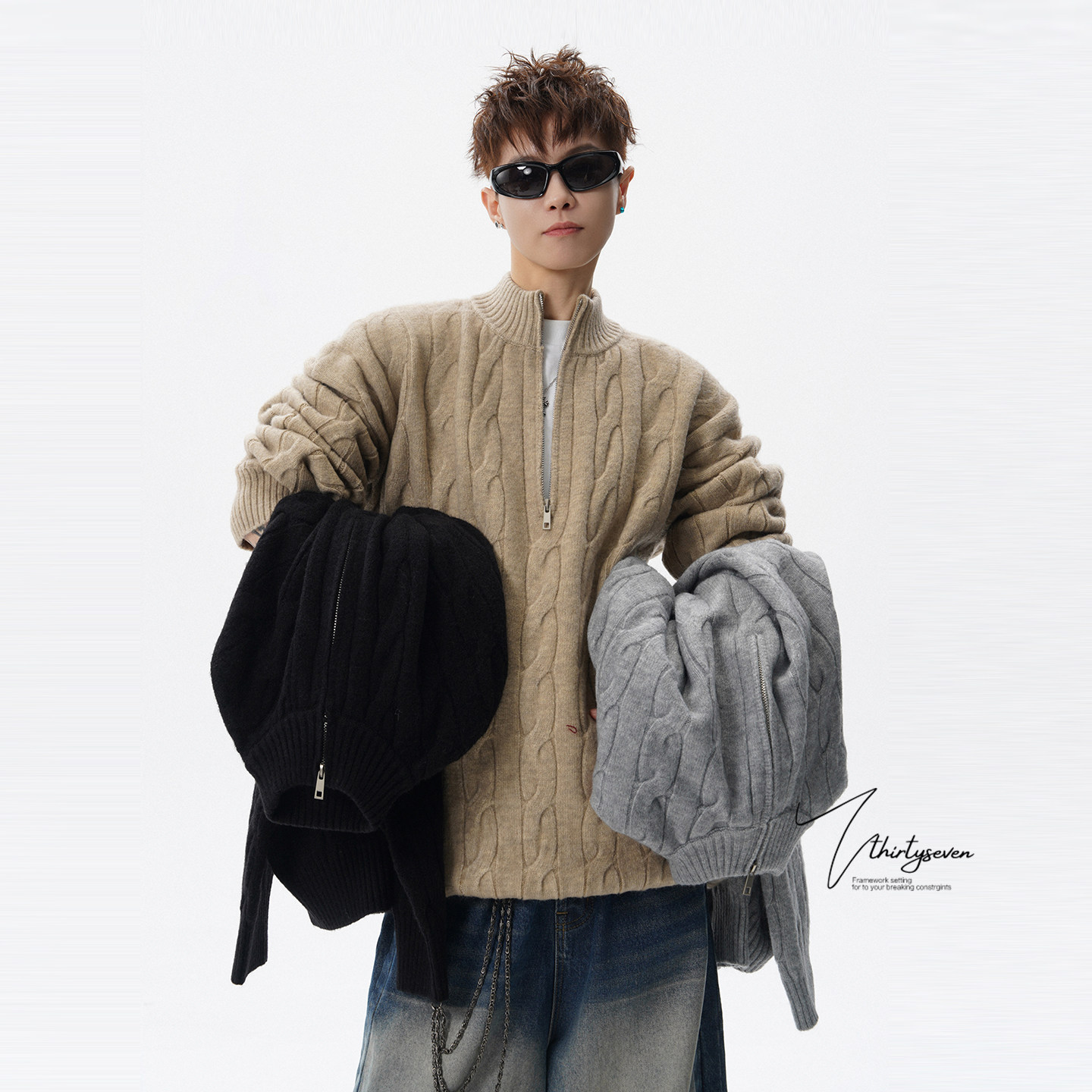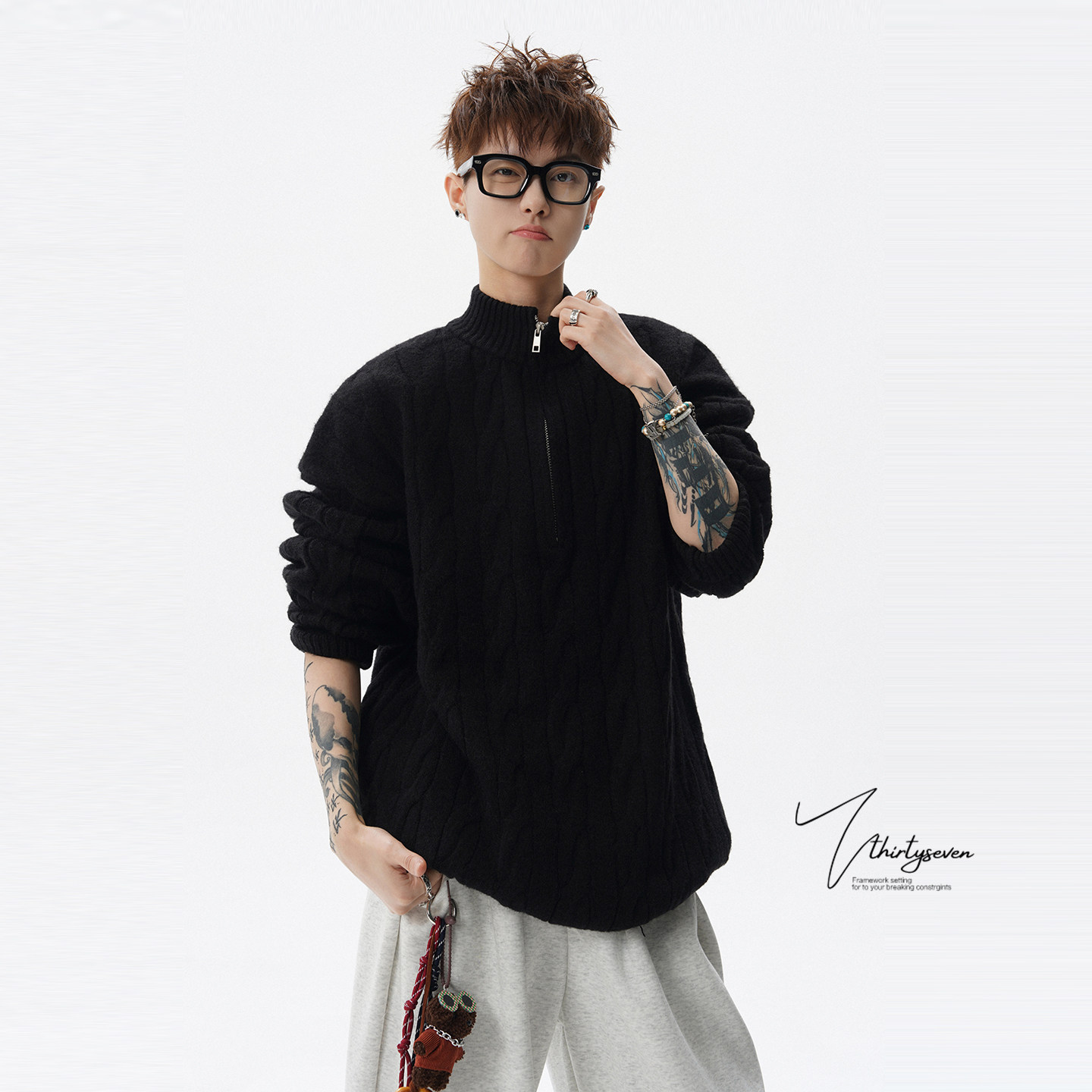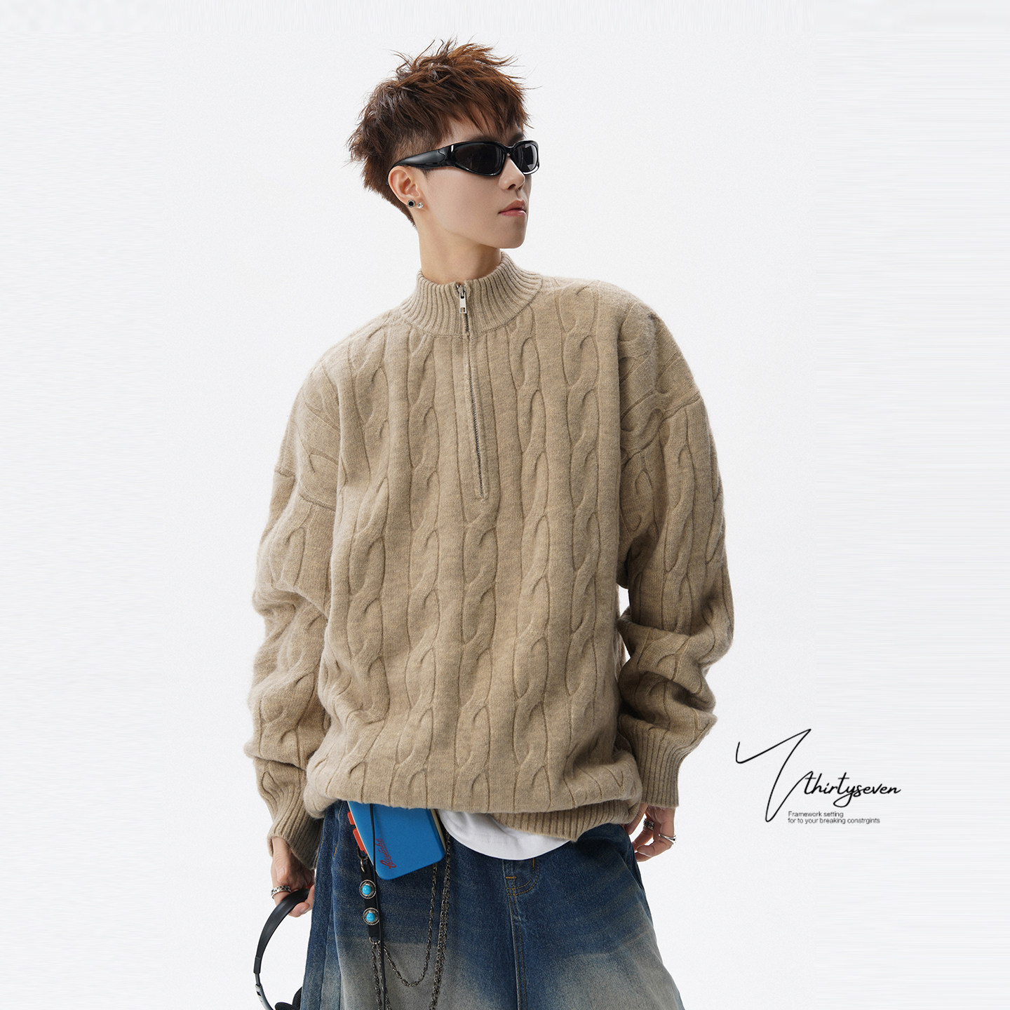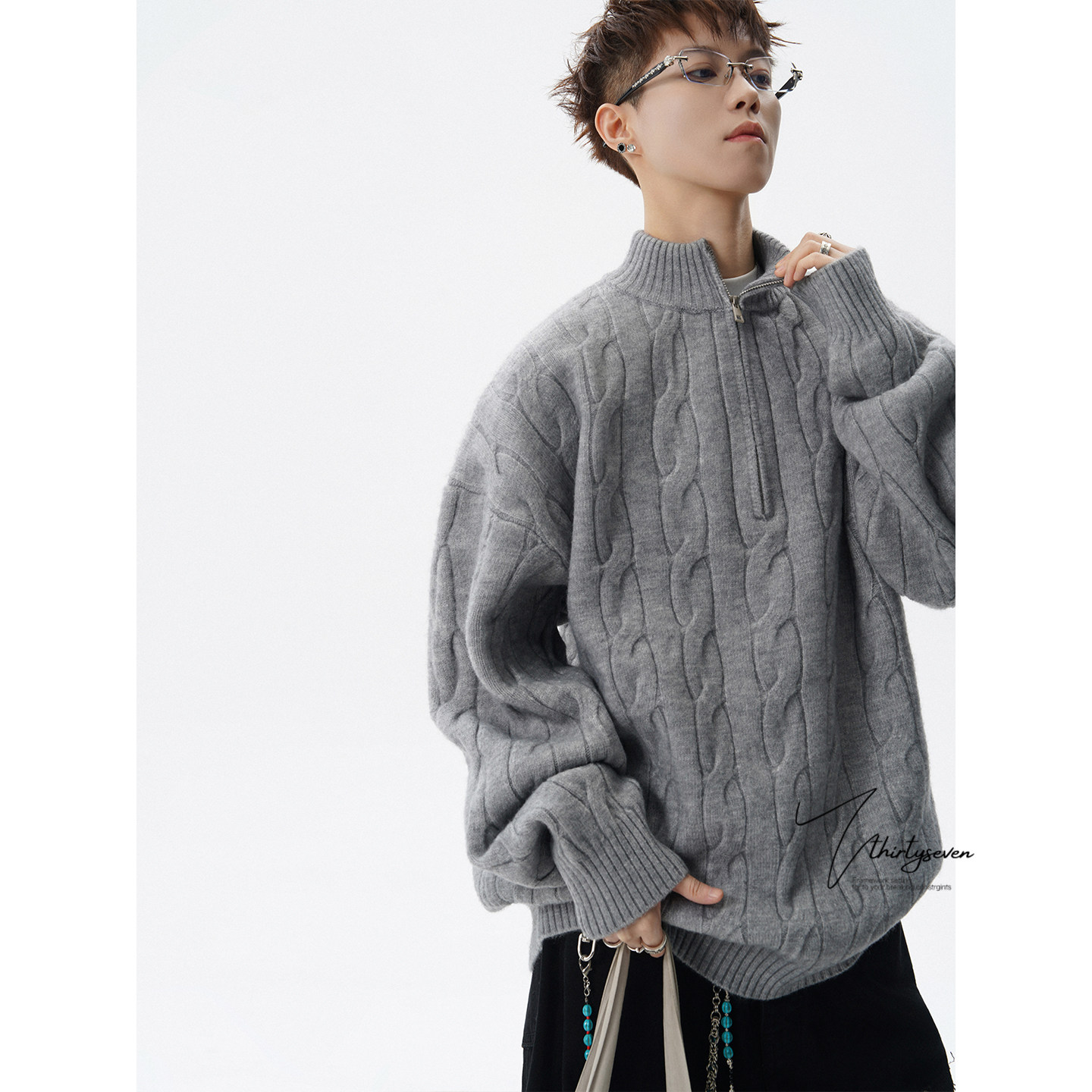 V37美式 男春灰色半开襟休闲百搭毛衣 慵懒风半拉链立领麻花针织衫由
